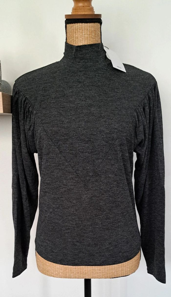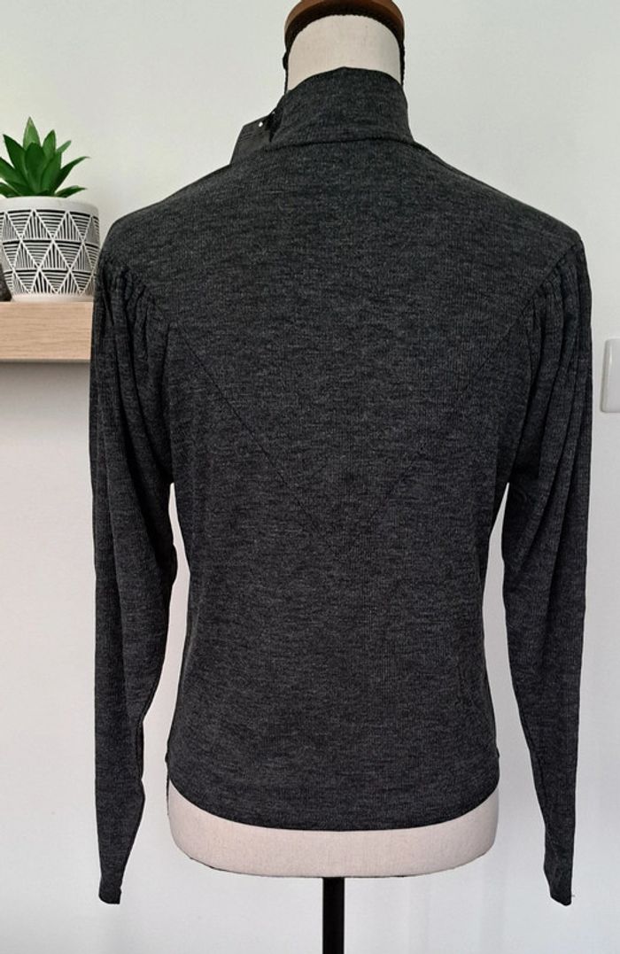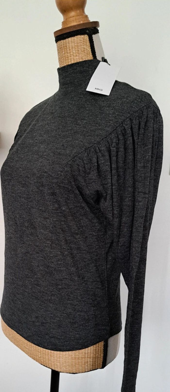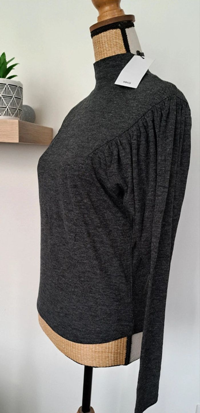 Pull gris MNG, col montant MNG, sur le devant et dans le dos empiècement en pointe, haut des manches ballon, taille S, neuf avec étiquette.