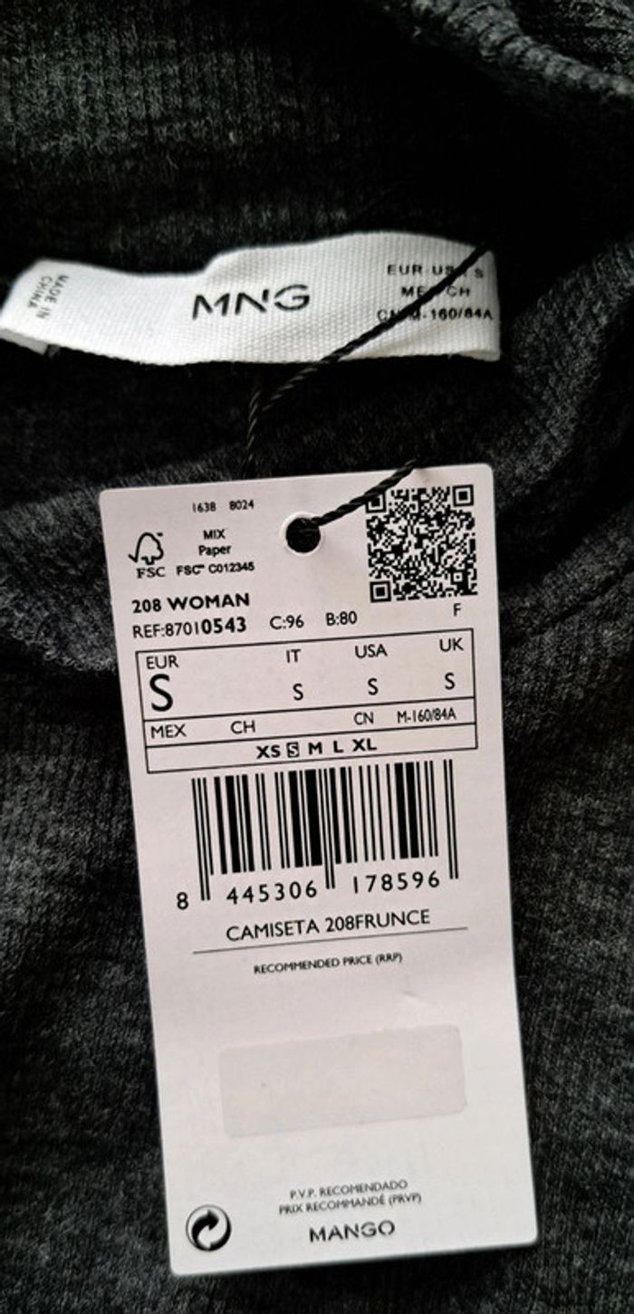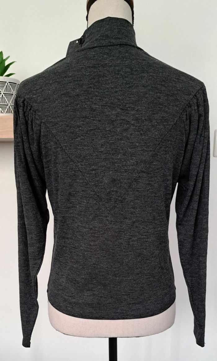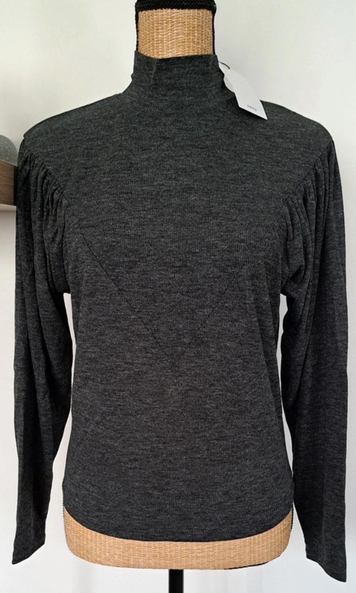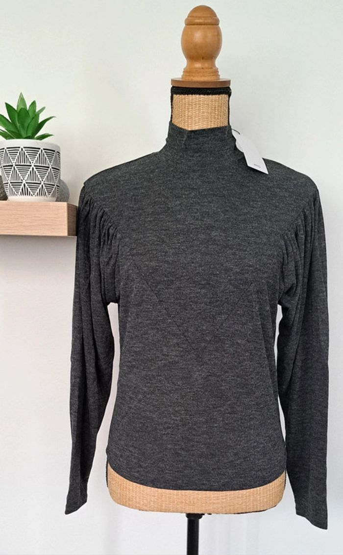 Pull gris MNG, col montant MNG, sur le devant et dans le dos empiècement en pointe, haut des manches ballon, taille S, neuf avec étiquette.