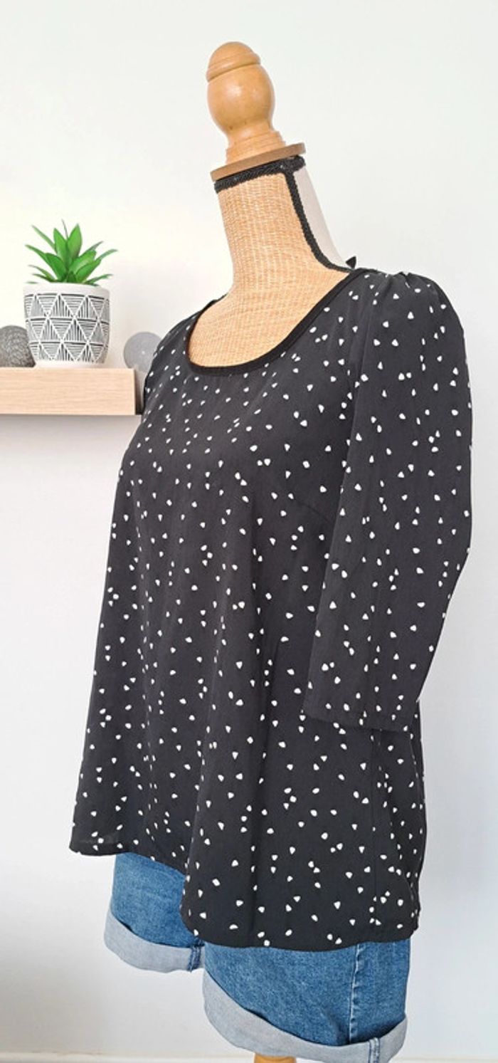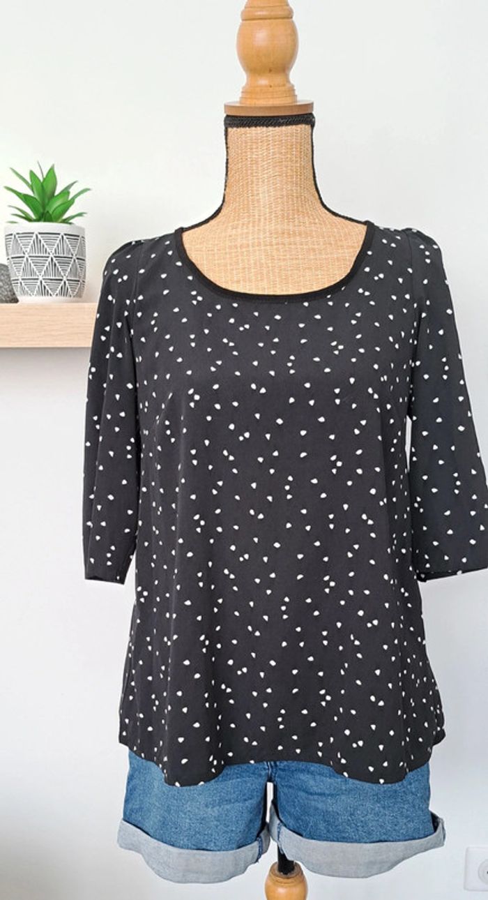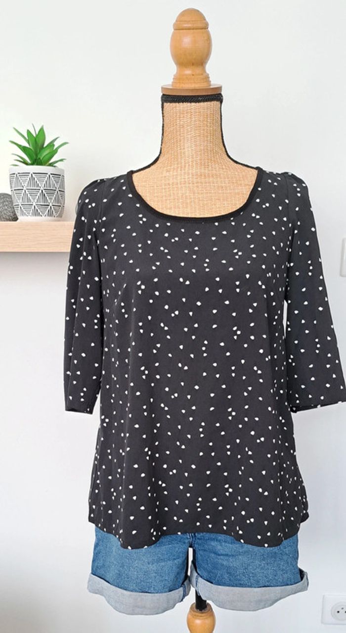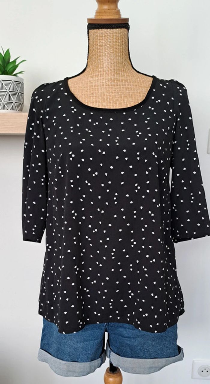 Très belle blouse Cache Cache noir avec des points blancs, taille 36, manches trois quarts, en très bon état.