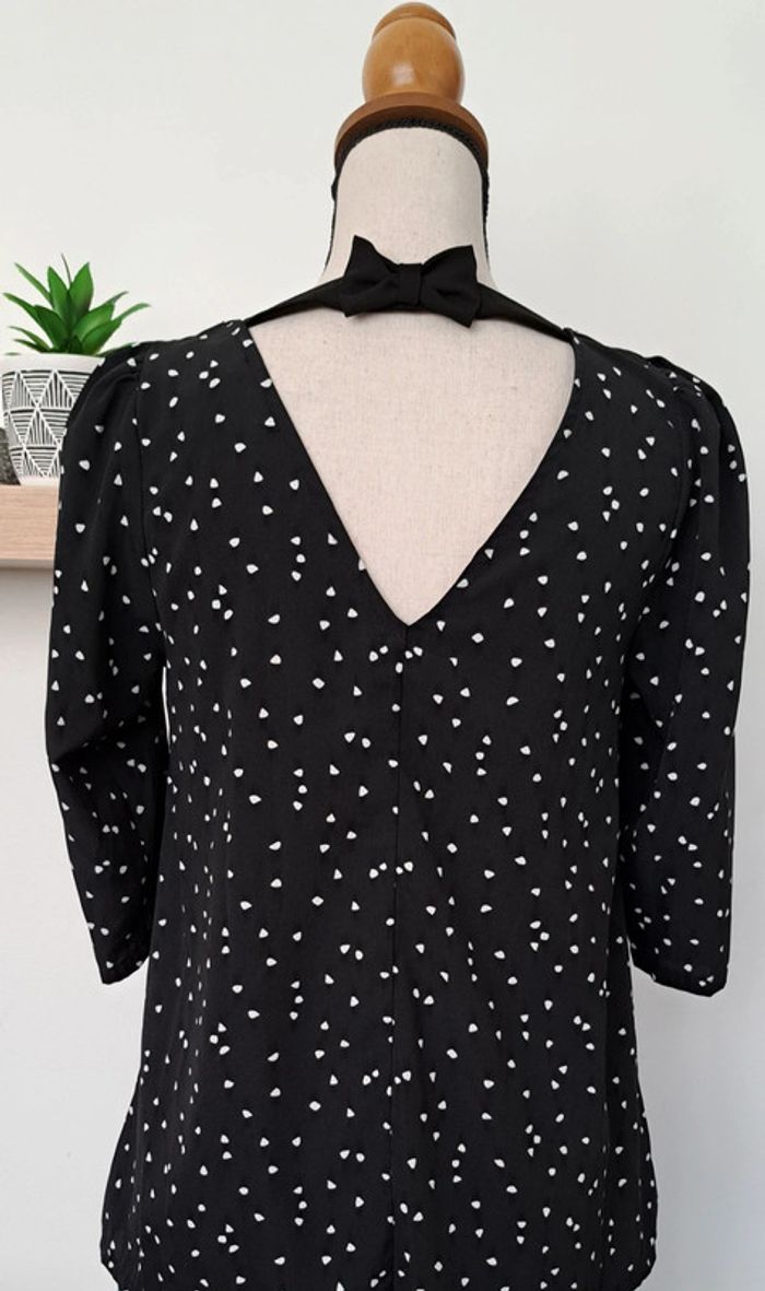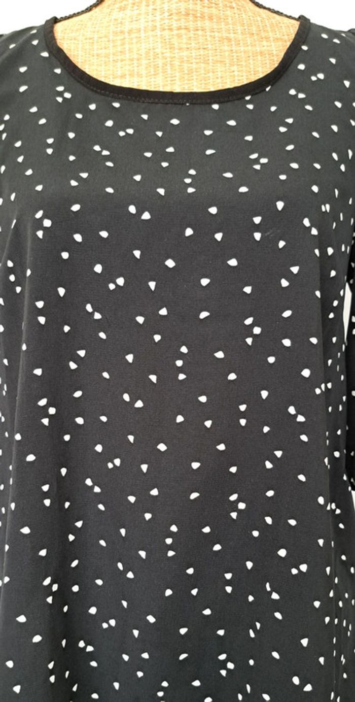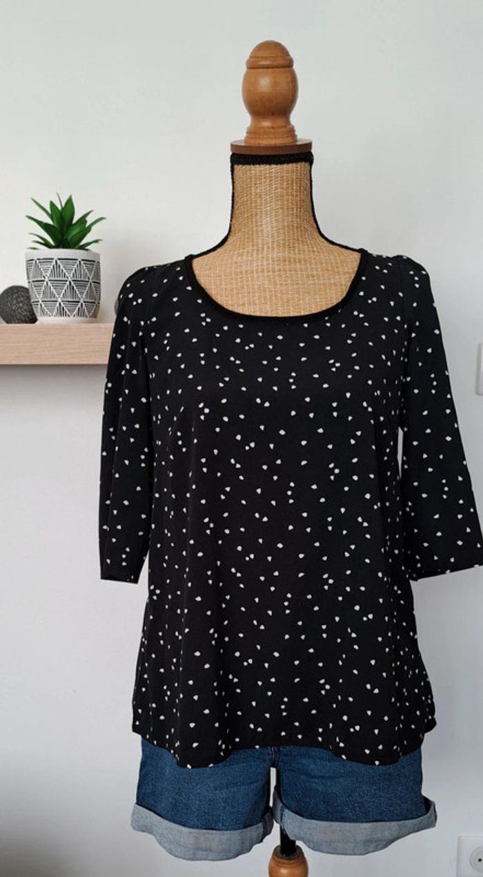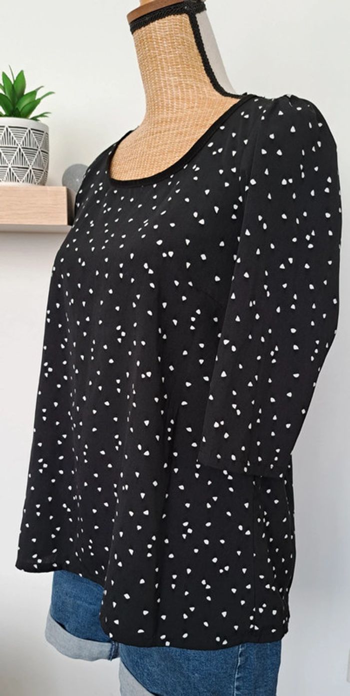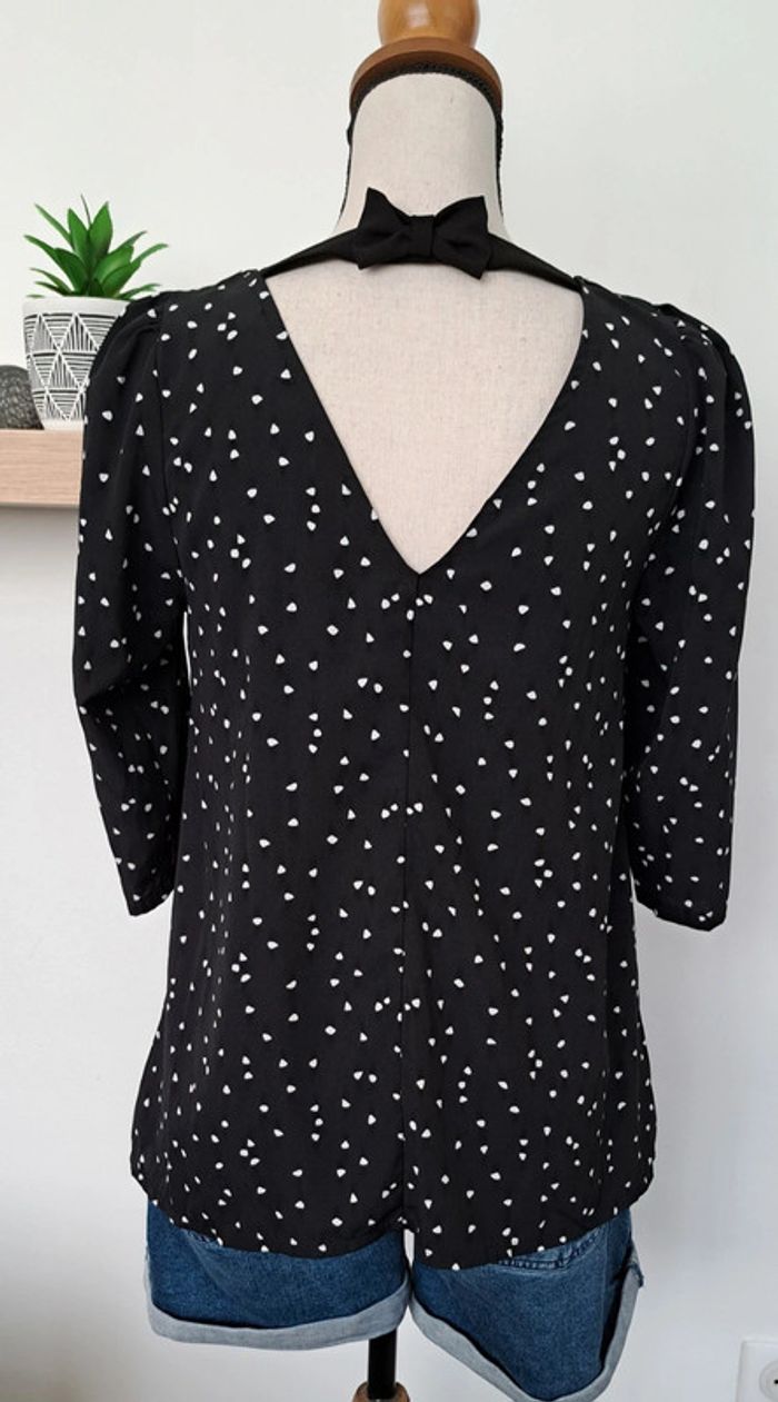 Très belle blouse Cache Cache noir avec des points blancs, taille 36, manches trois quarts, en très bon état.