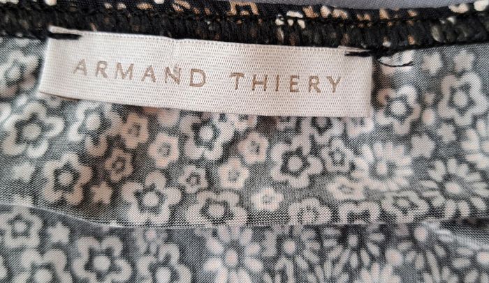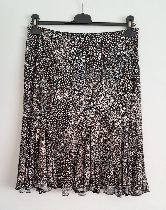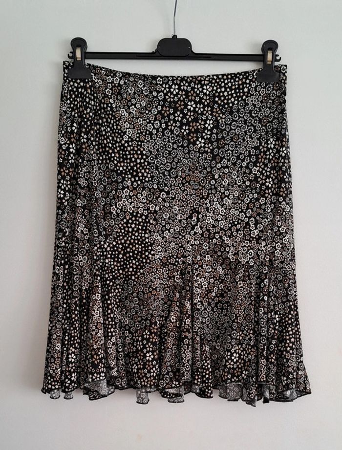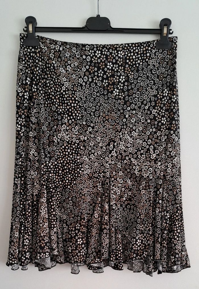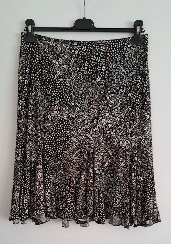 Très belle jupe imprimée Armand Thiery, taille élastique, motif fleurs, avec des volants , taille 42, en très bon état.