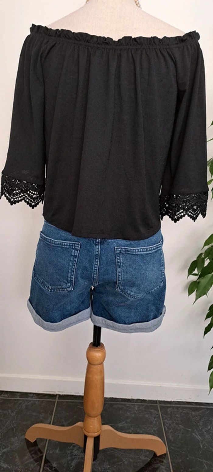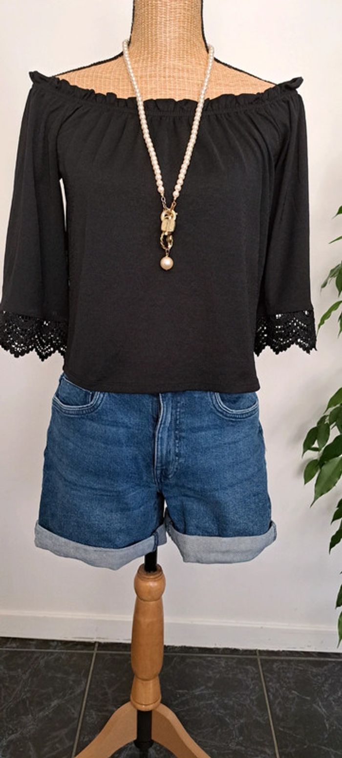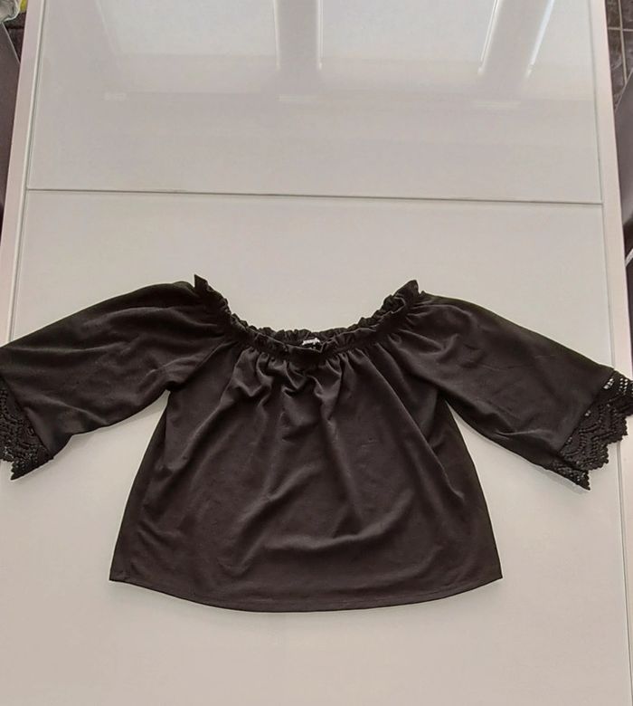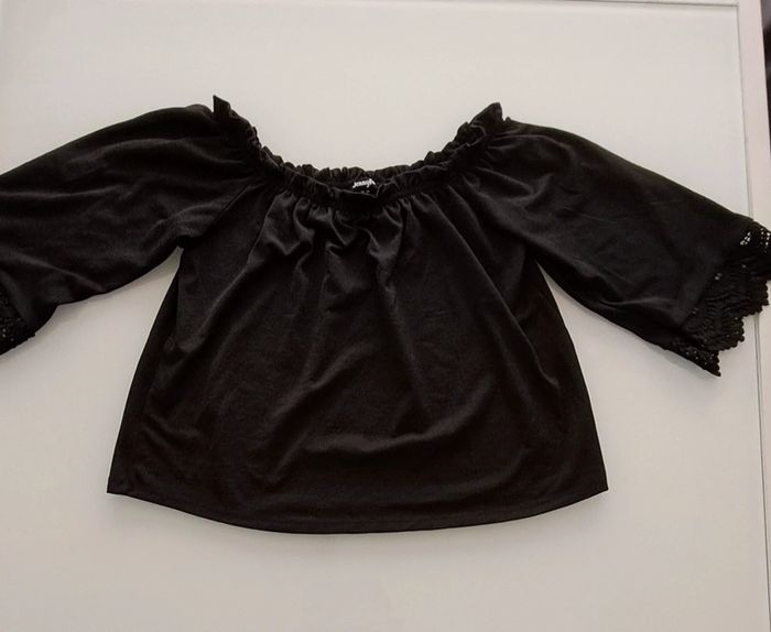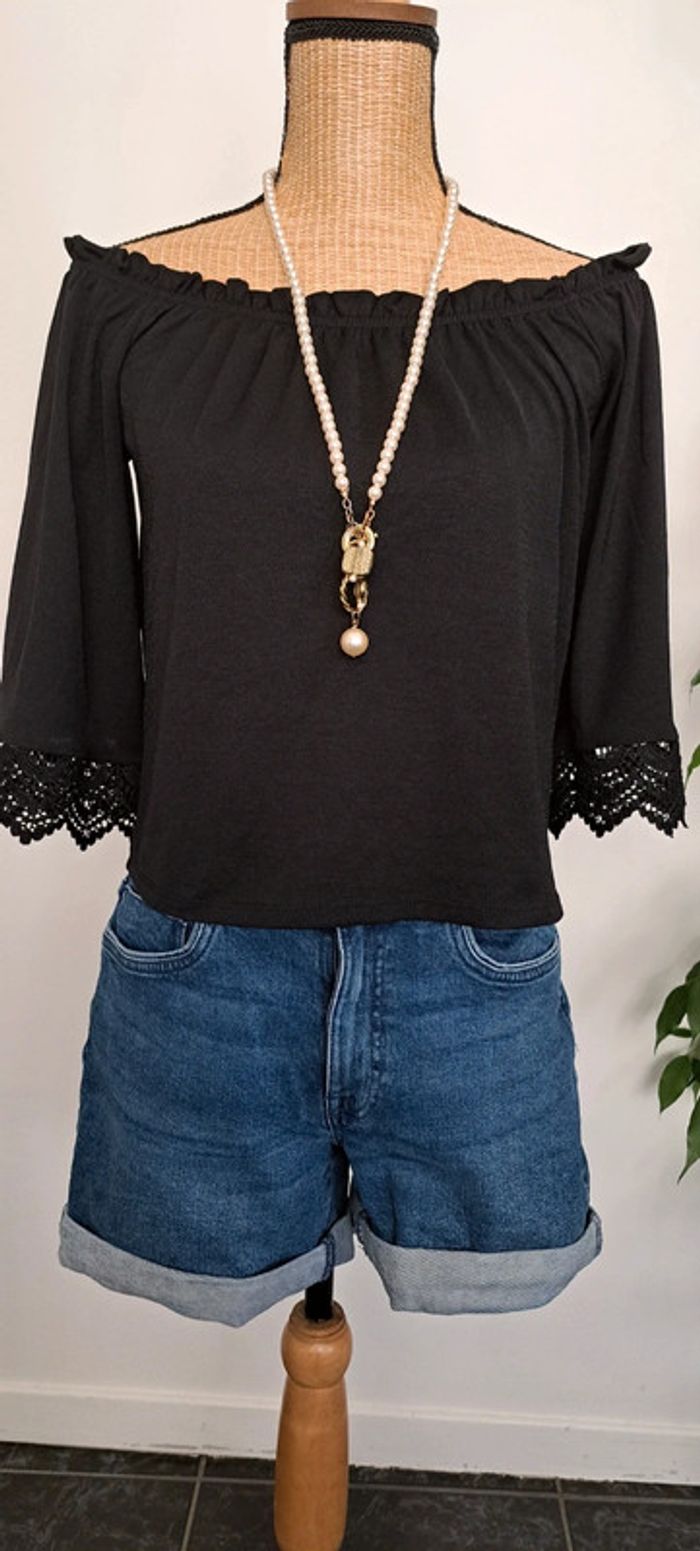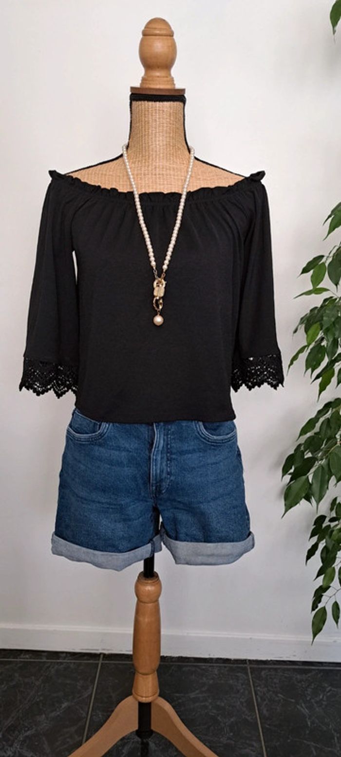 Très belle blouse noire Jennyfer, col bardot à volants froissés, manches trois quarts , taille XS, en très bon état.
