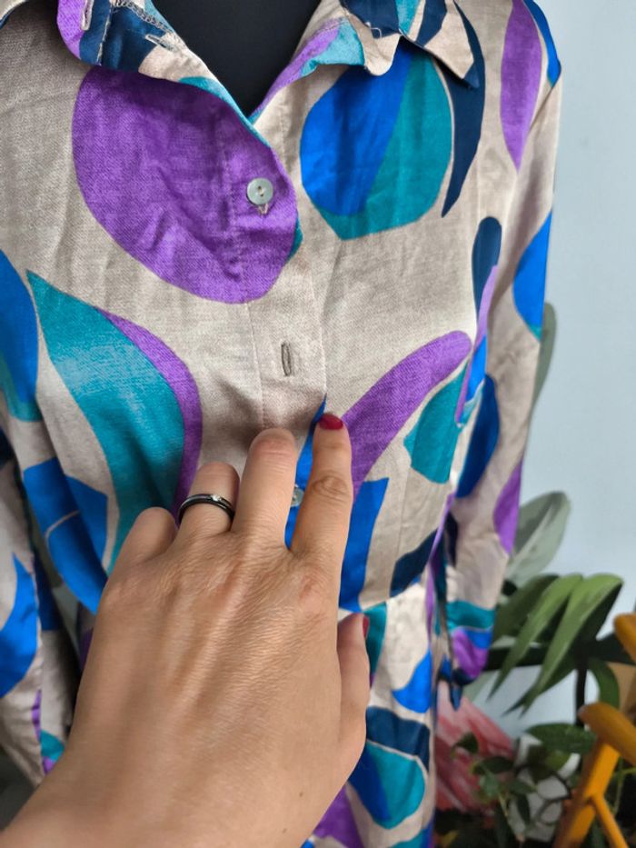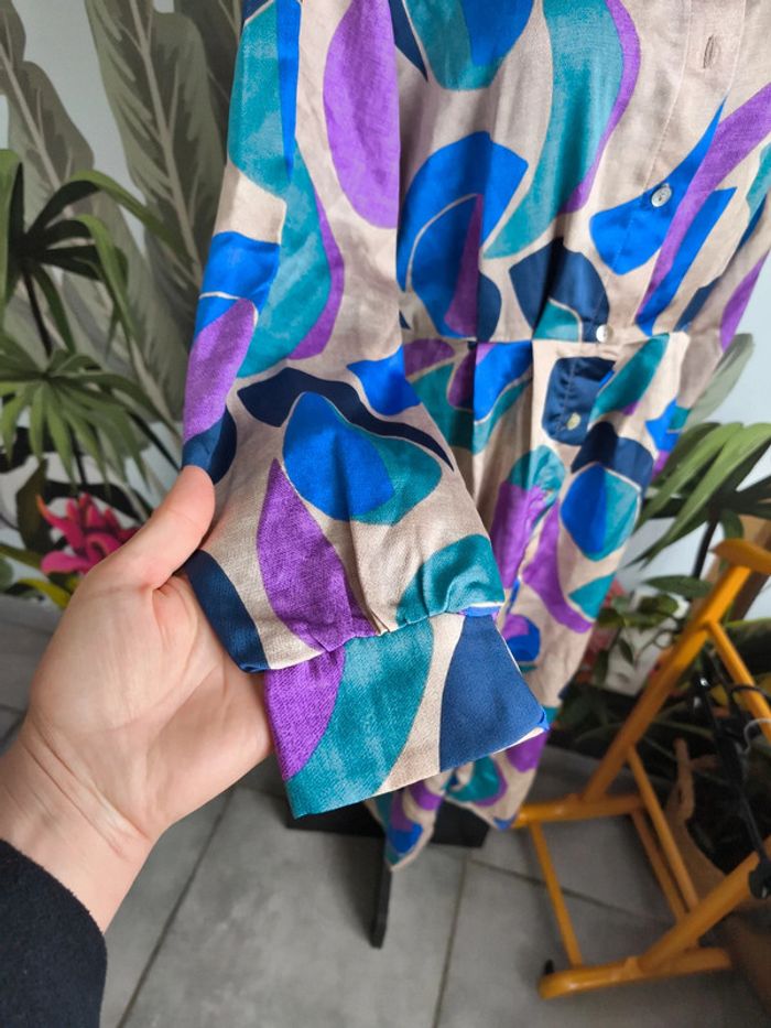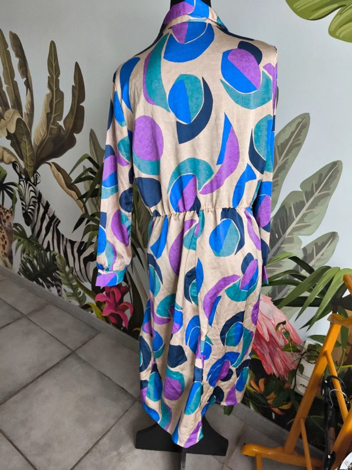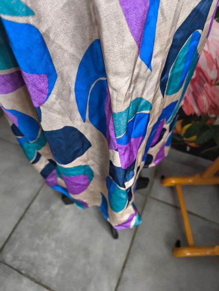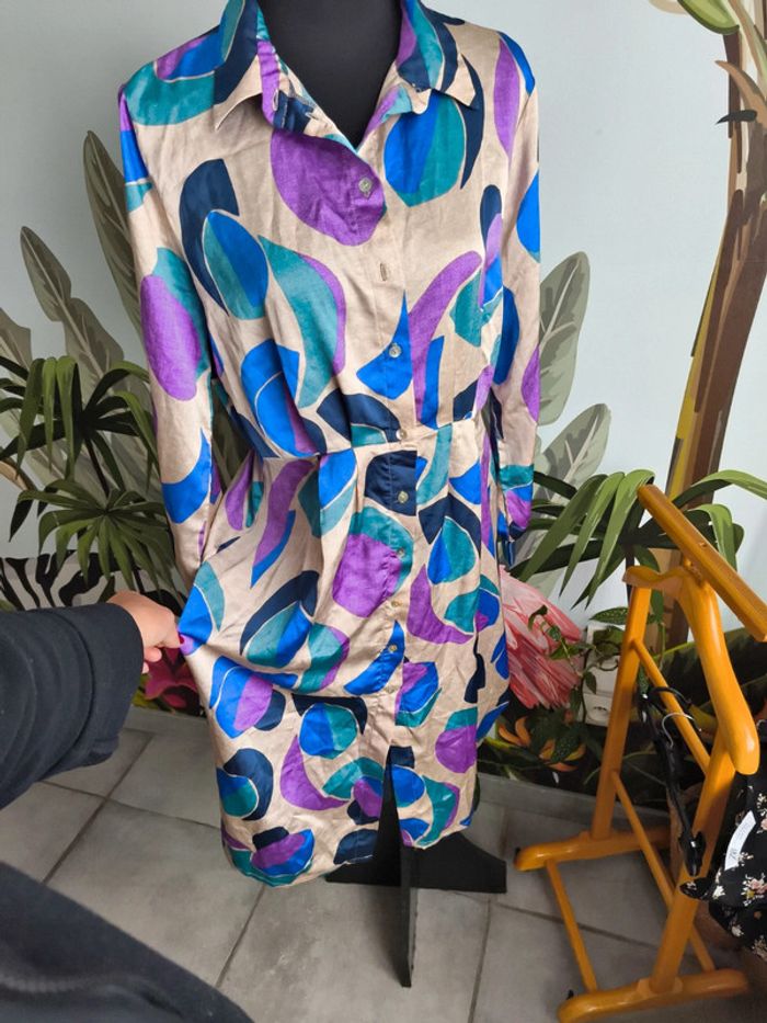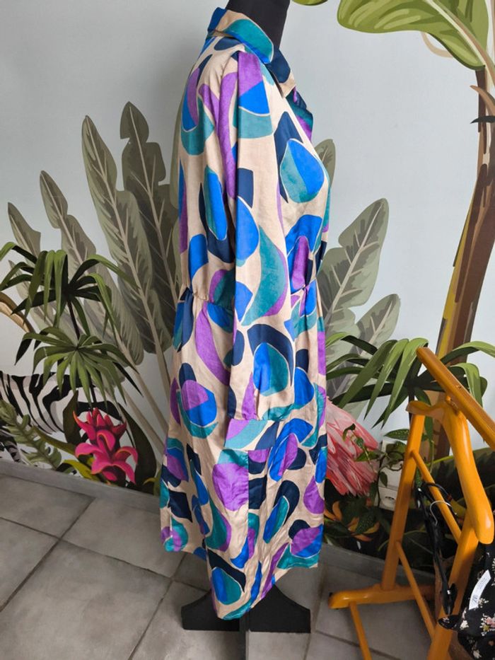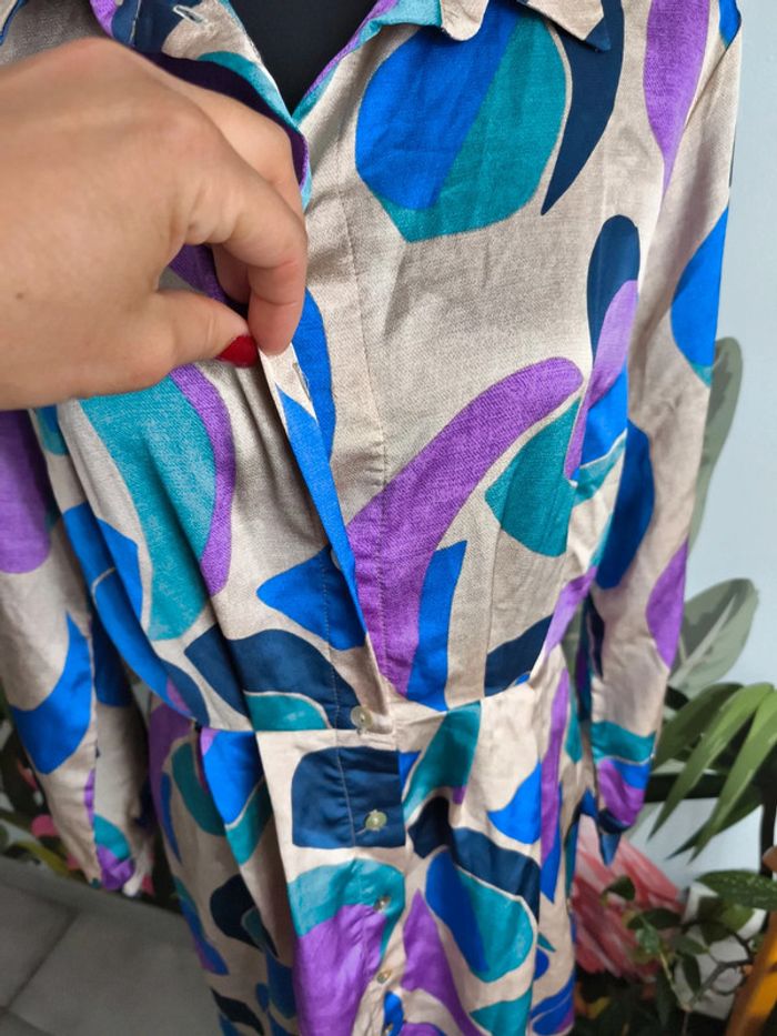 #XL42marylinebonte ☺️ N'hésitez pas à consulter mes autres annonces, 🏵️Robe colorée, touché satiné, Kiabi taille L 42/44. Fermeture par boutons ( il en manque un). Défaut mineur dans le tissu voir photos. 📏 Longueur 112.5cm Aisselle 53cm Taille 41cm Épaule 40cm