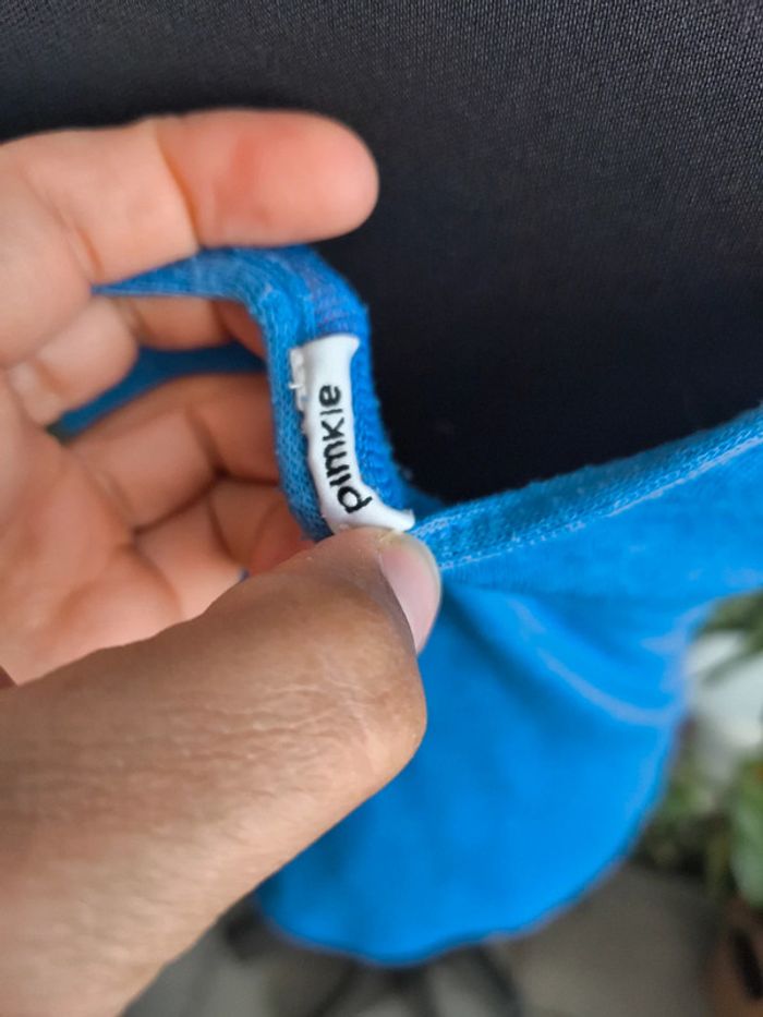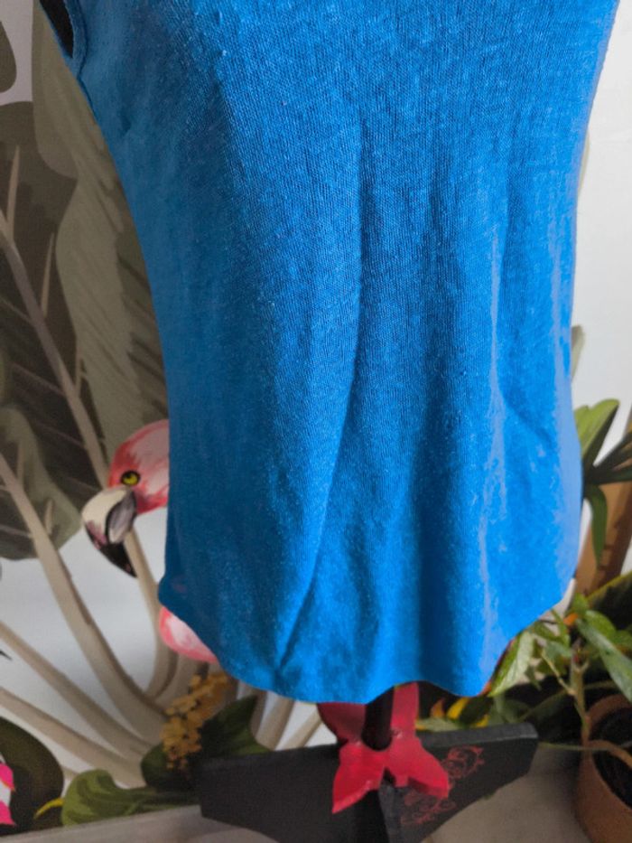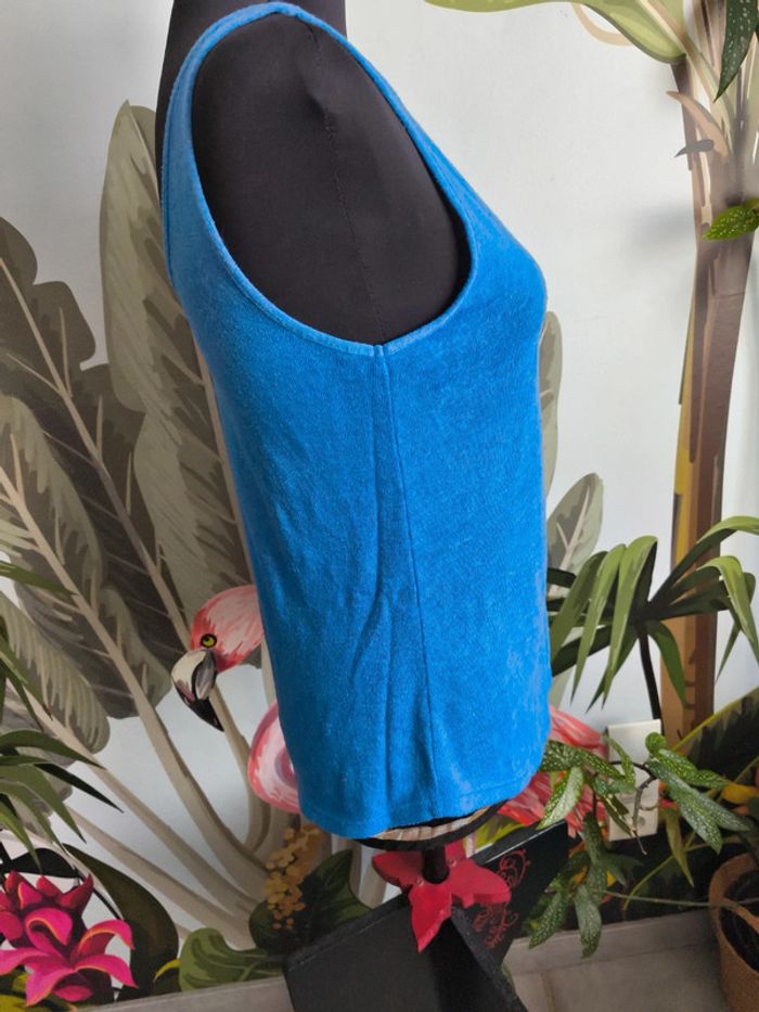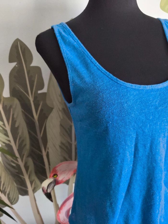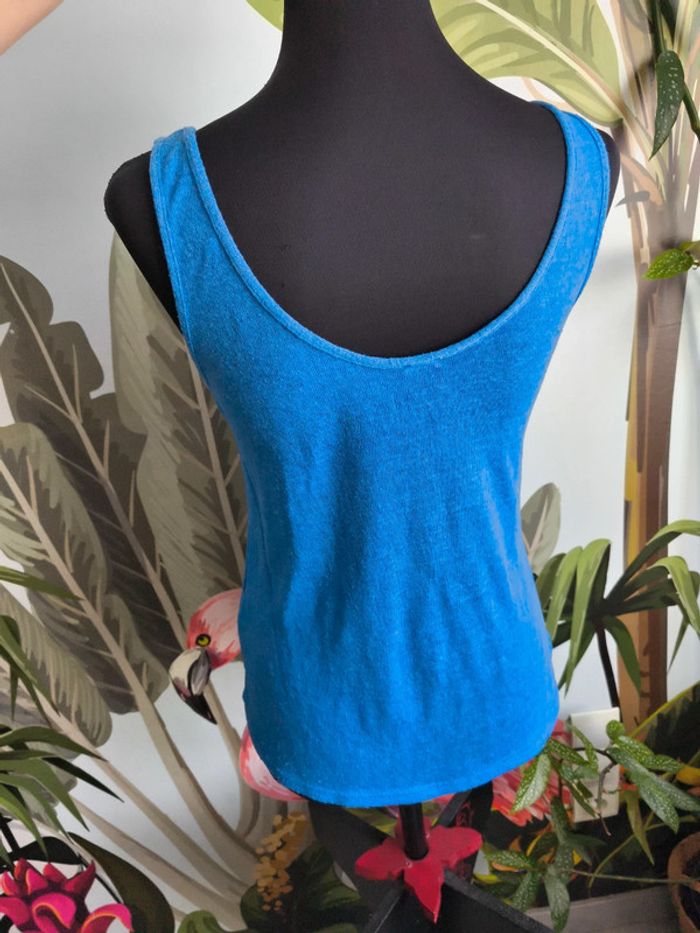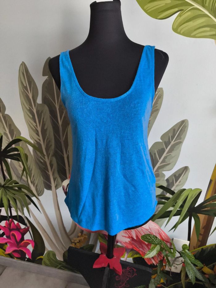 #M38marylinebonte 😊 N'hésitez pas à consulter mes autres annonces, 🏵️Débardeur bleu Pimkie. Noté taille XS mais taille très grand plutôt S/M, merci de vérifier les mesures, plutôt transparent. A noter bouloches et défaut tissu fil tiré voir dernière photo 📏 Aisselle 41cm Longueur 57cm