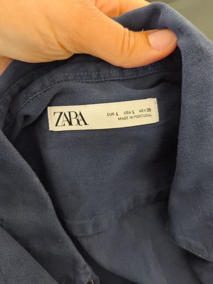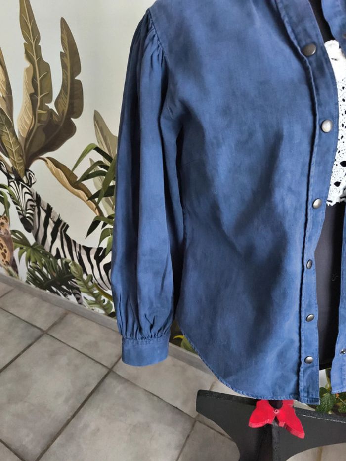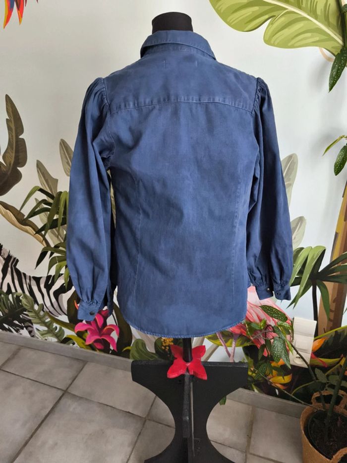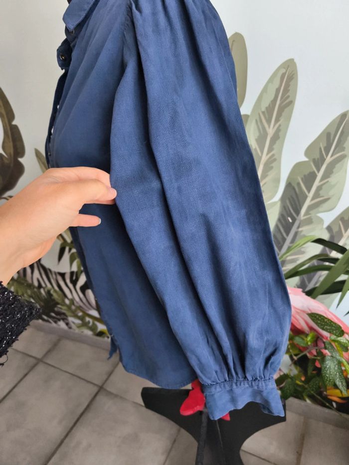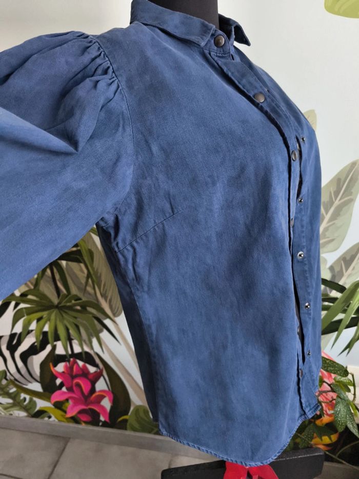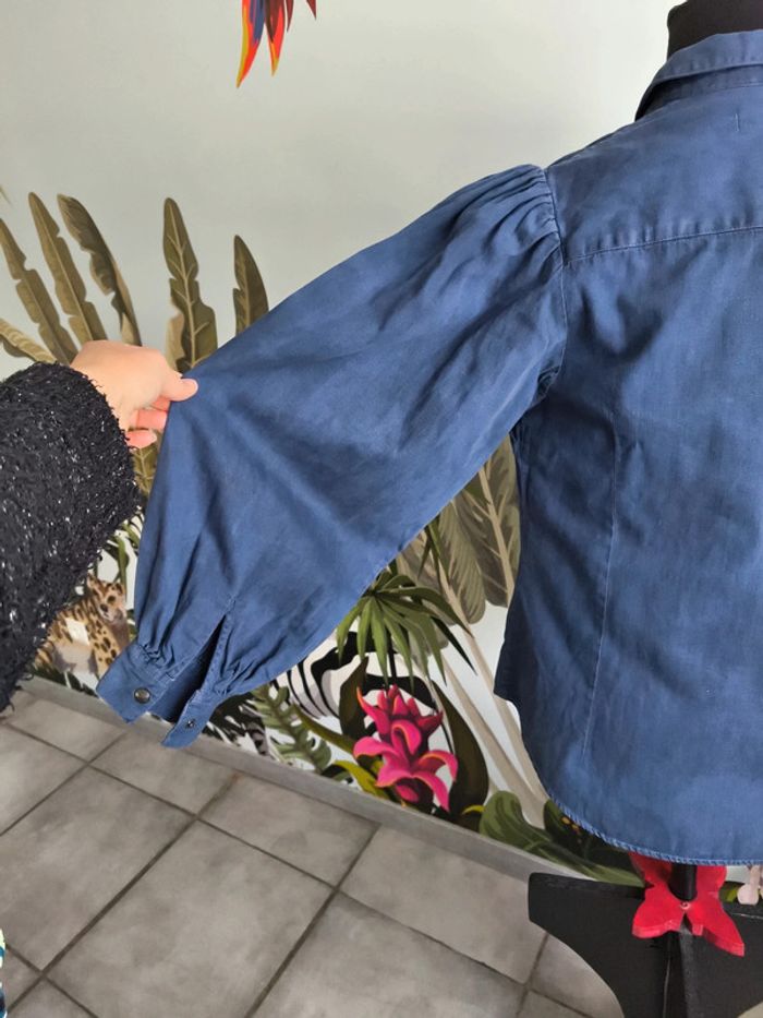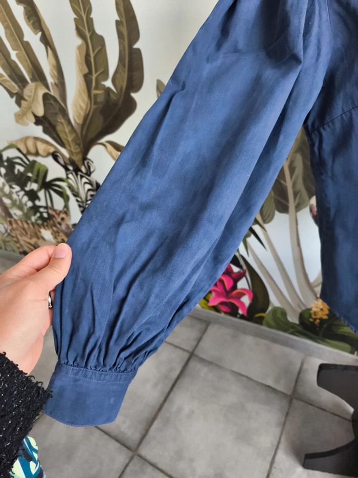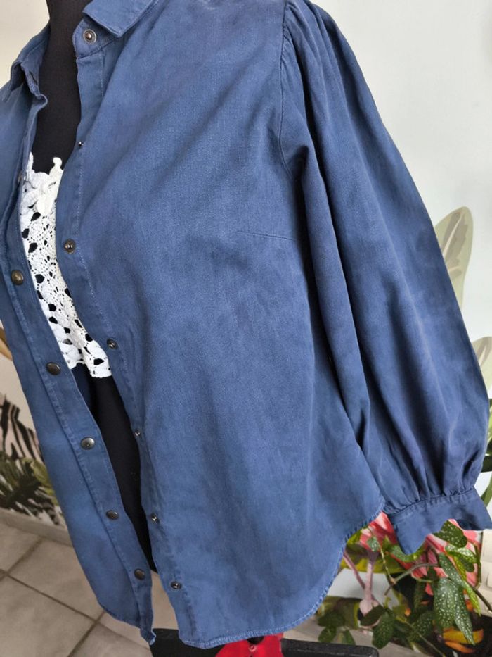 #L40marylinebonte 😊 N'hésitez pas à consulter mes autres annonces, 🏵️Veste / chemise bleu Zara taille L. Manches bouffantes. Fermeture par boutons pressions. A noter que le bleu a des "tâches " un peu partout plus foncé, prévoir une teinte. 📏 Longueur 68cm Aisselle 48.5cm