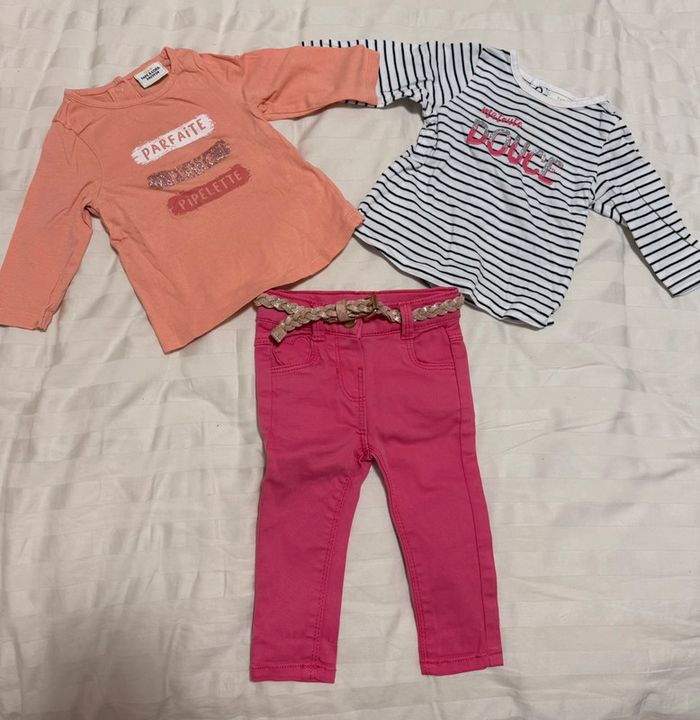 2 tee shirts manches longues et un pantalon coton avec sa ceinture souple tressée TAO tape à l’œil Très bon état Joli ensemble