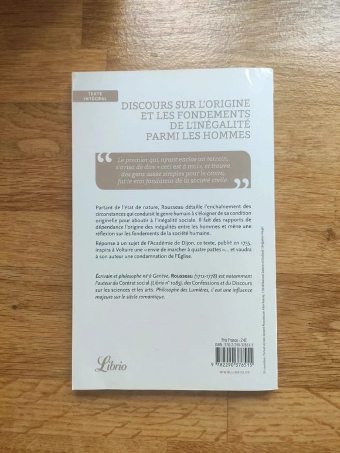 Discours sur l'origine et fondements de l'inégalité parmi les hommes de Jean Jacques Rousseau. Livre jamais lu mais couverture arrière un peu abîmée à plusieurs endroits #vulariLivres