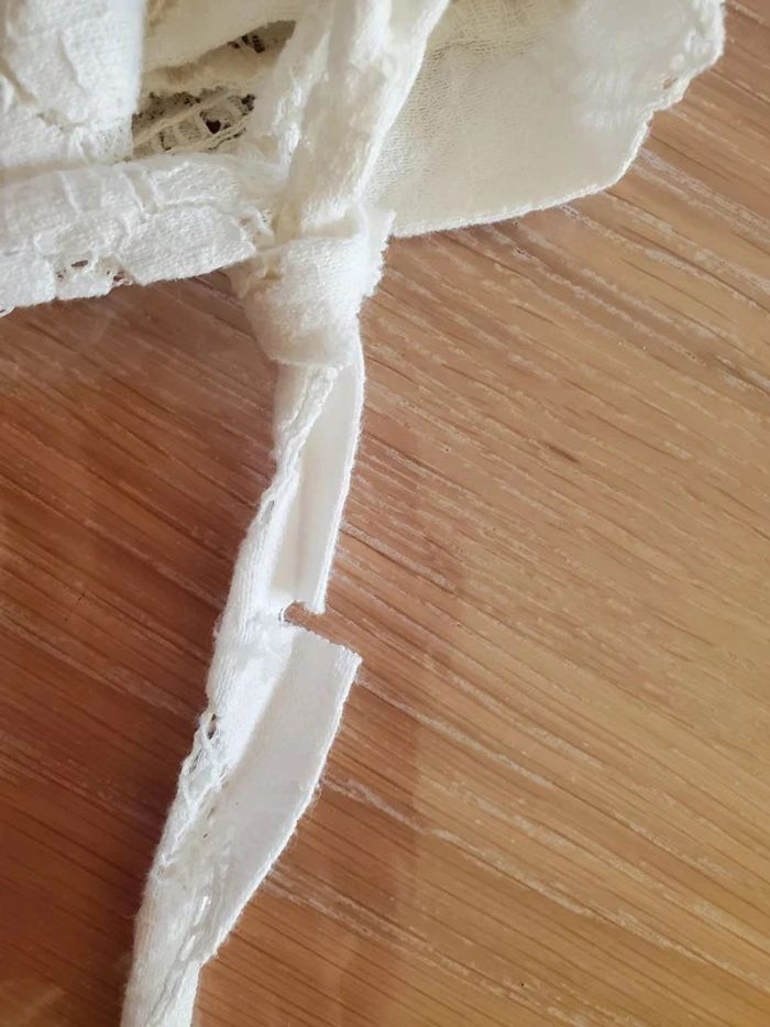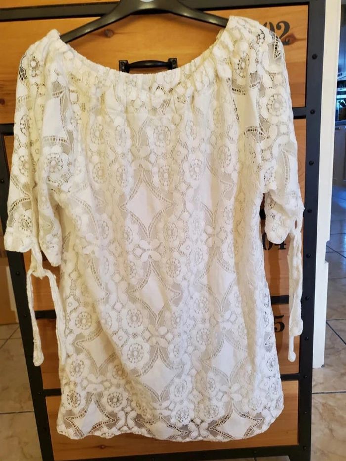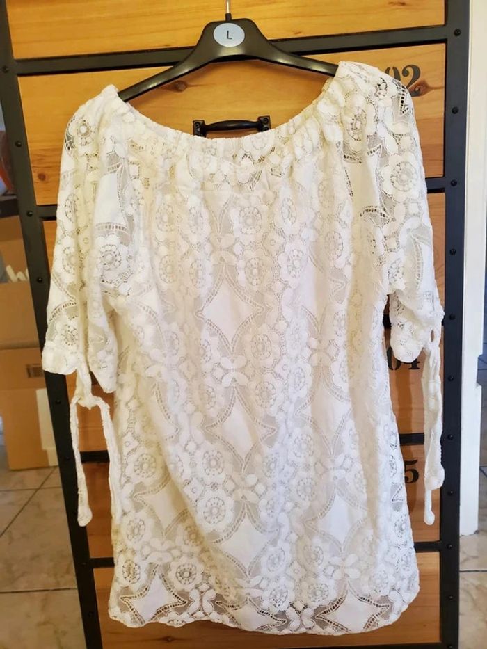 Jolie tunique blanche Taille 40/42 Légère coupure sur le nœud de la manche voir dernière photo sinon parfait état #sabrina668340 #sabrina668342