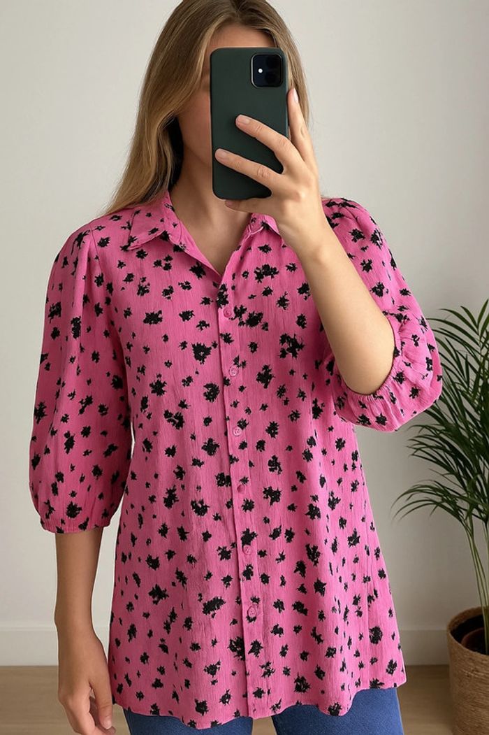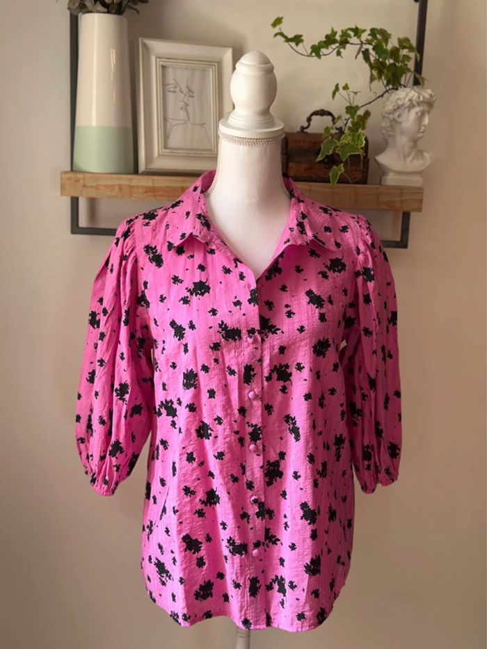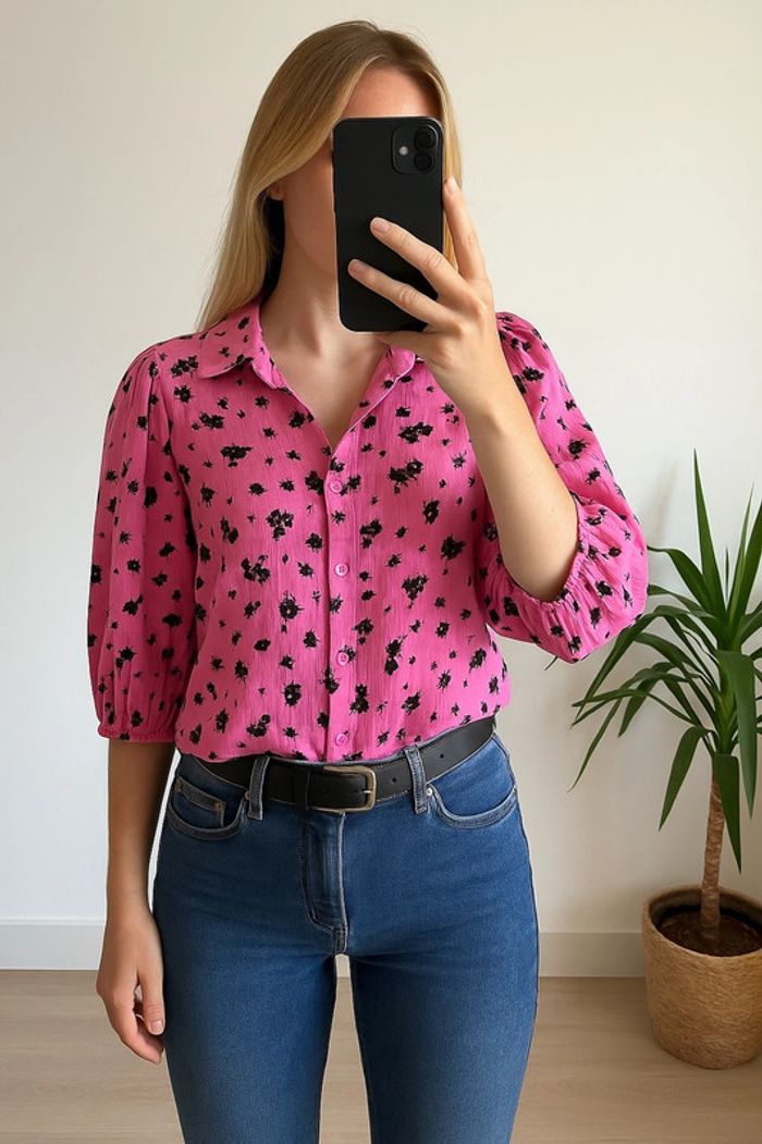 Blouse fluide de la marque Ichi, dans une jolie teinte rose framboise parsemée de petits motifs noirs. Coupe droite et légèrement ample, manches 3/4 bouffantes avec poignets élastiqués. Col chemise classique, fermeture boutonnée ton sur ton. Le tissu gaufré (80 % viscose, 20 % nylon) apporte une belle texture, tout en restant léger et agréable à porter. Taille 36, convient bien coupe légèrement ample. Très bon état. ℹ️ Photo portée générée à titre illustratif, pour vous donner une idée du rendu.
