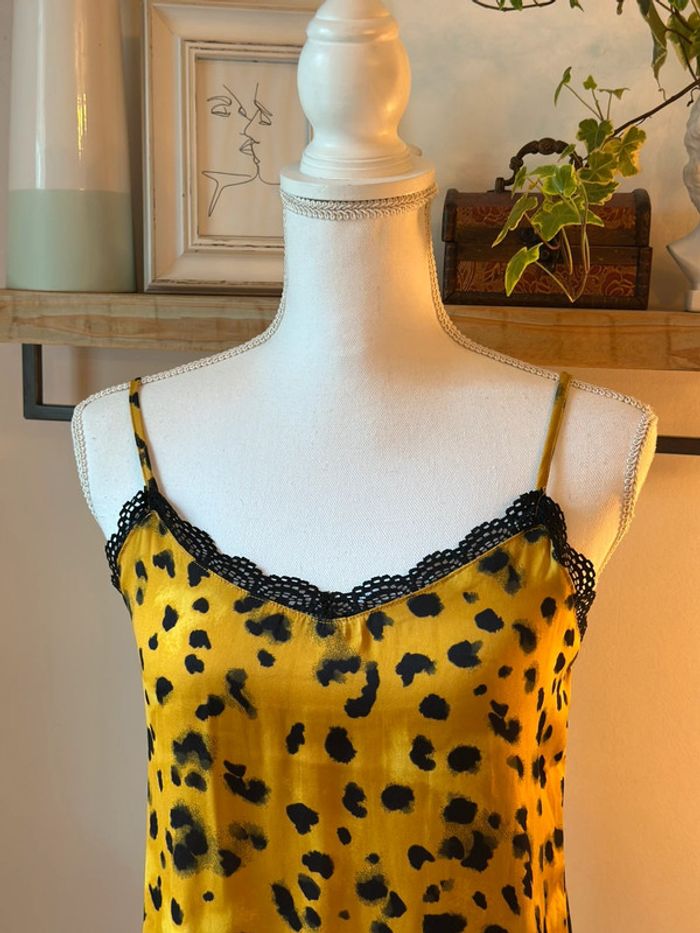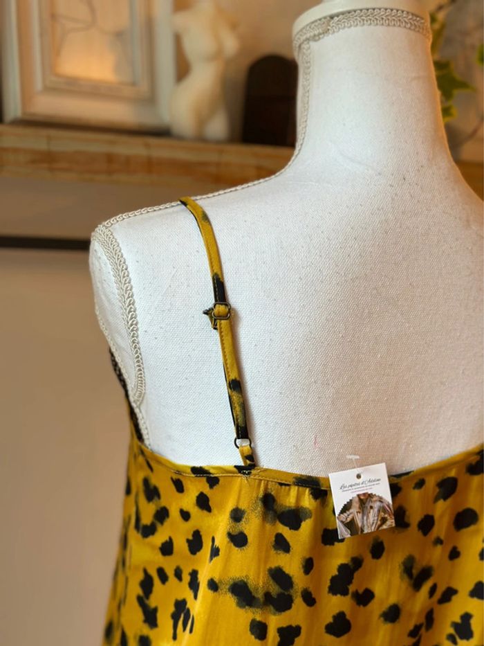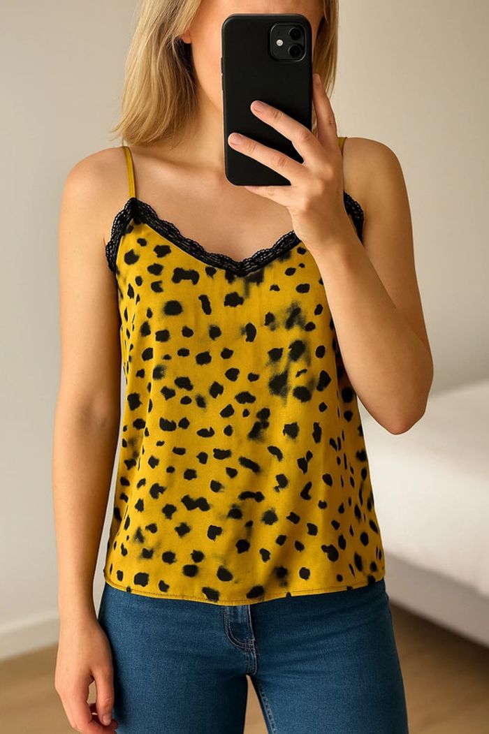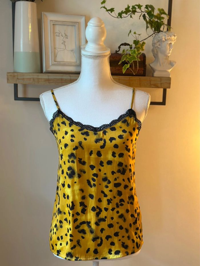 Joli débardeur satiné à fines bretelles ajustables, imprimé léopard sur fond jaune lumineux 🐆💛. Détail dentelle noire délicate au niveau du décolleté pour une touche féminine très chic. Matière fluide, agréable à porter, qui tombe joliment. Taille indiquée 34, convient parfaitement à un 34 classique. En très bon état, aucune trace d’usure à signaler. Une pièce audacieuse et stylée, parfaite en été avec un short ou glissée sous un blazer pour une allure plus habillée !