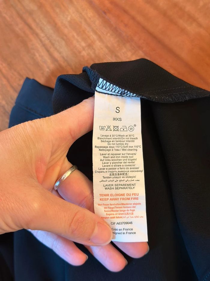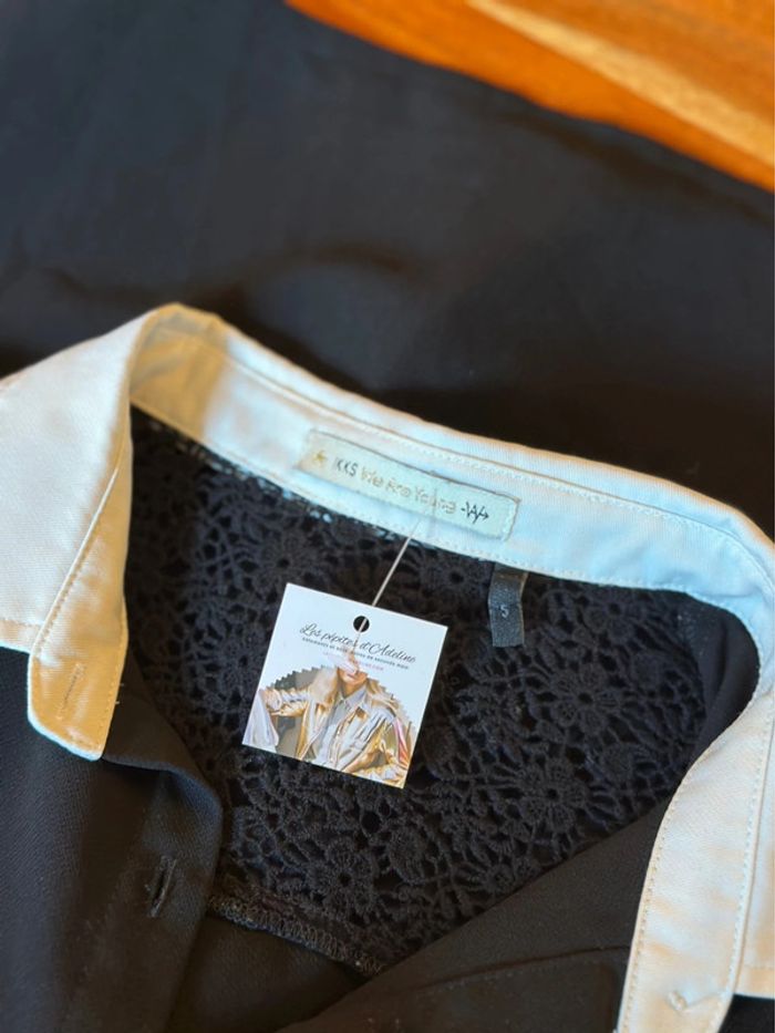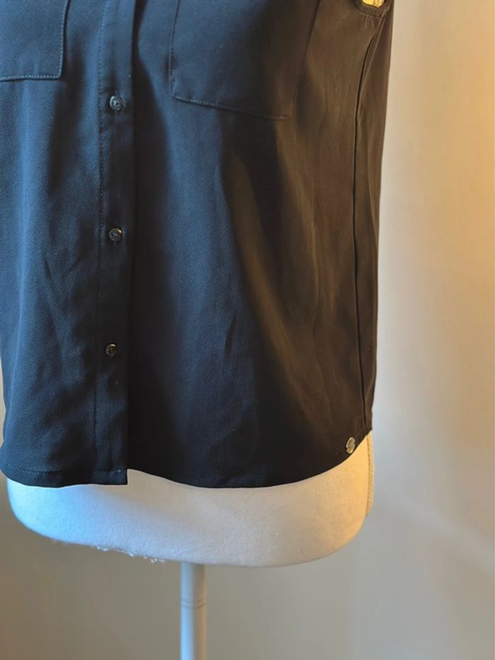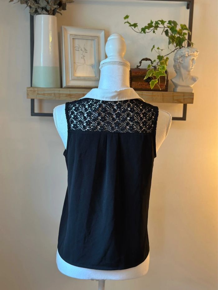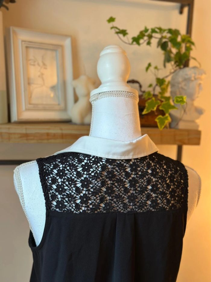 Joli haut sans manches noir de chez IKKS, coupe droite et légère, avec col blanc contrastant très chic. Le détail qui fait la différence ? Le dos en dentelle noire délicate, pour une touche féminine subtile. Fermeture à boutons sur le devant et deux poches plaquées poitrine. Taille indiquée : S, convient aussi à un XS. Très bon état, aucun défaut à signaler. Idéal pour un look pro ou casual selon comment tu l’associes. 📌 Une belle pièce intemporelle à avoir dans sa garde-robe !