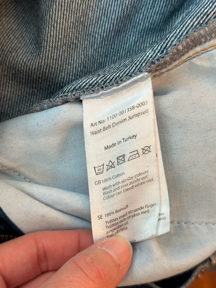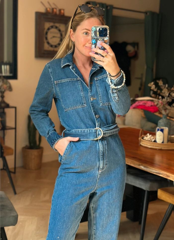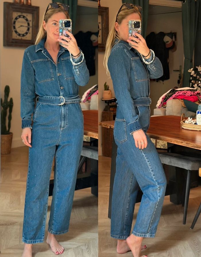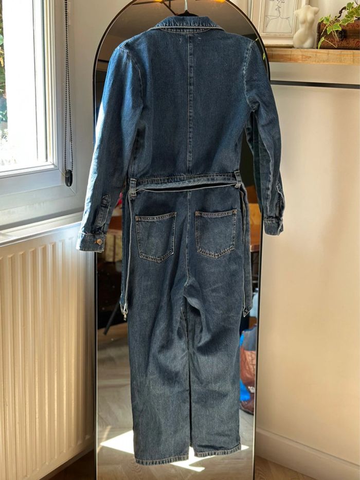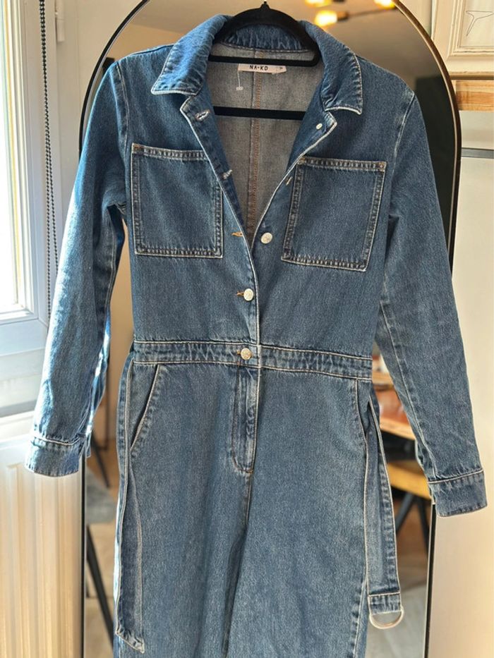 Combinaison en denim de la marque NA-KD, en excellent état. Coupe droite, col chemise, poches plaquées sur le devant et ceinture assortie pour marquer la taille. Fermeture boutonnée, matière 100 % coton agréable à porter. Taille 34, convient bien à une personne faisant du XS/S. Je mesure 1m60 pour info. Très belle coupe, ni trop large ni trop ajustée. Style workwear/pompiste tendance et facile à accessoiriser. Coupe droite au bas de la jambe, look structuré.
