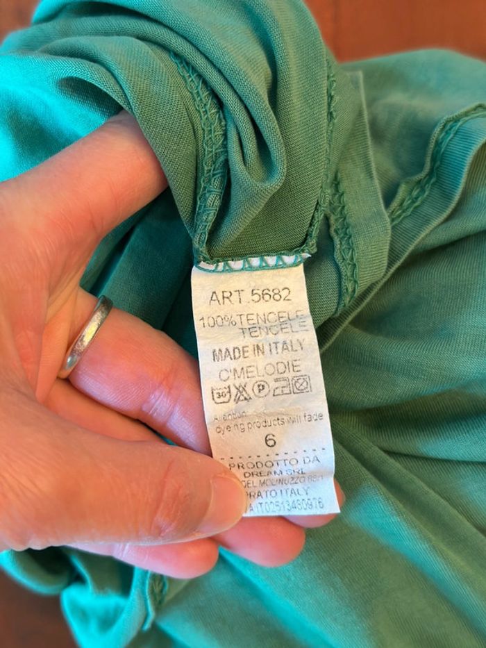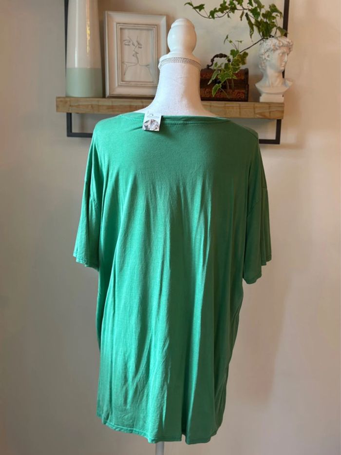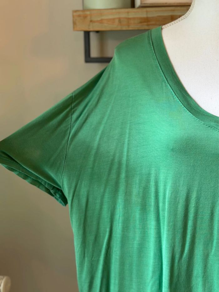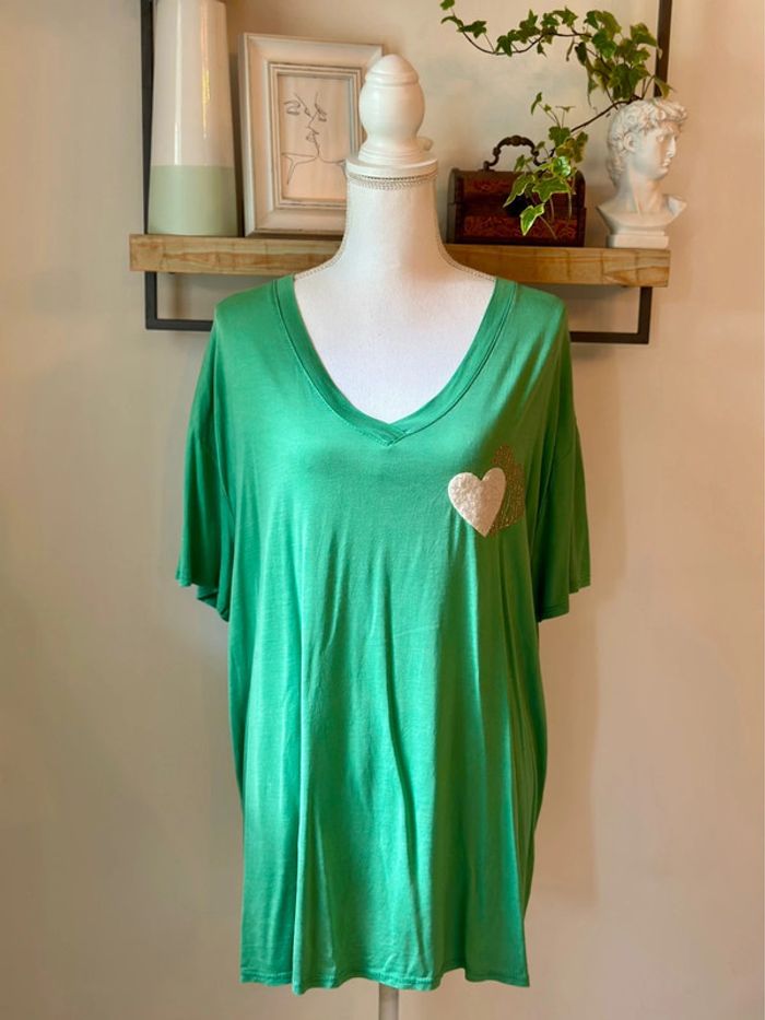 T-shirt à col V en Tencel 100 %, doux et fluide. Coupe oversize, taille U qui convient parfaitement aux tailles 40 à 44. Coloris vert vif avec deux cœurs brodés sur la poitrine (un blanc texturé en relief, l’autre à motifs dorés). Fabriqué en Italie. Mesures à plat : • Longueur : 76 cm • Aisselle à aisselle : 64 cm Très bon état. ℹ️ Photo portée générée à titre illustratif, pour vous donner une idée du rendu.
