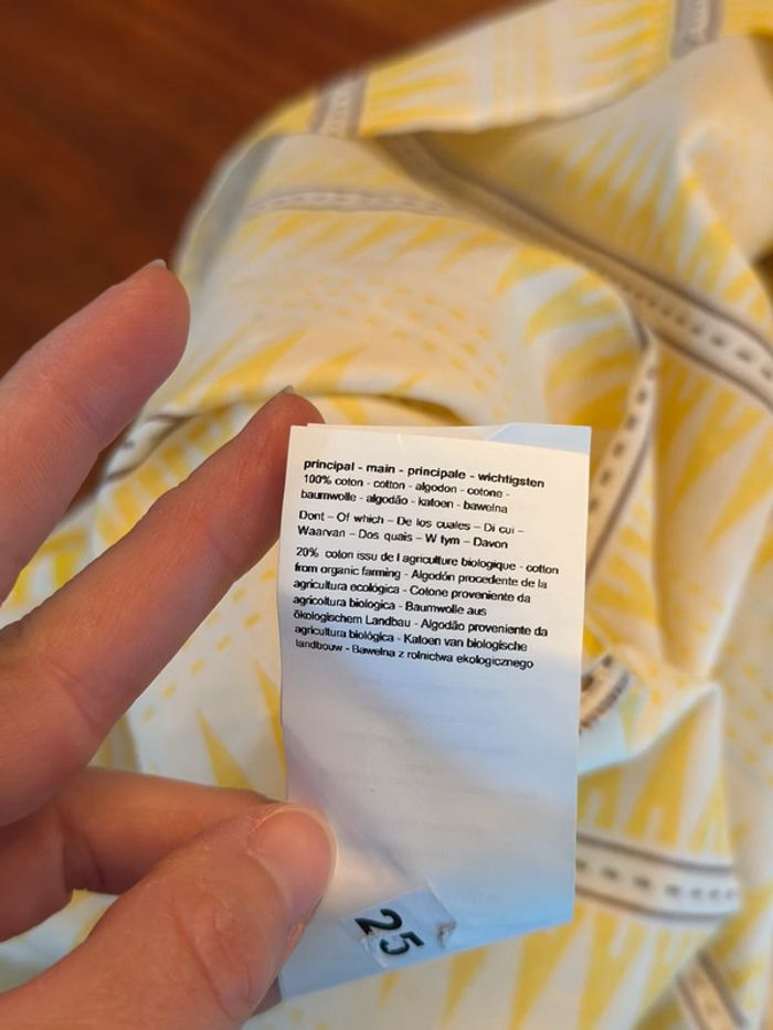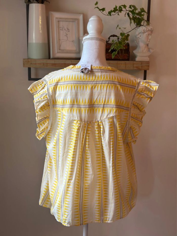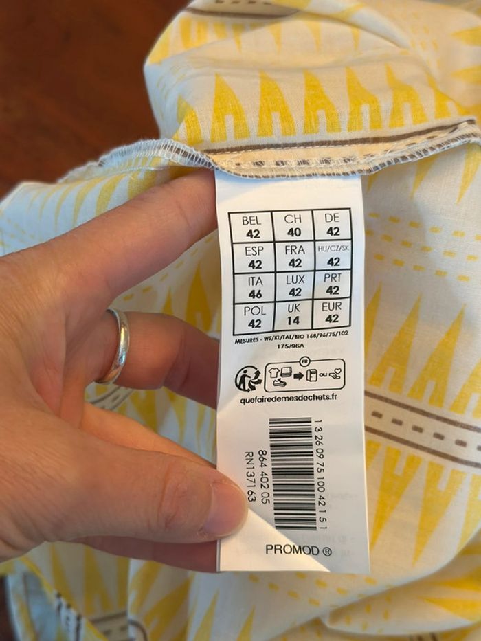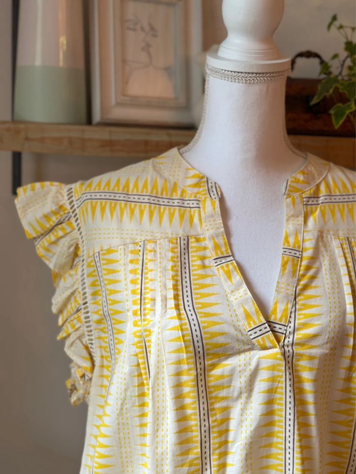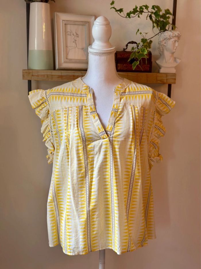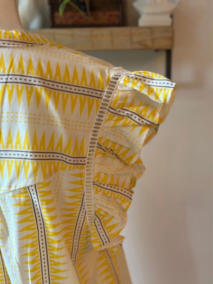 ℹ️ Le prix est fixe et il n'est pas éligible à la remise. Blouse légère et fluide 100 % coton, imprimée de motifs graphiques jaunes et blancs. Détails féminins : manches courtes à volants et encolure en V. Coupe droite et confortable, parfaite pour la mi-saison ou l’été. Matière : 100 % coton (dont 20 % issu de l’agriculture biologique) Mesures à plat : • Aisselle à aisselle : 55 cm • Longueur totale : 65 cm La taille 42 convient bien. En excellent état. ℹ️ Photo portée générée à titre illustratif, pour vous donner une idée du rendu.