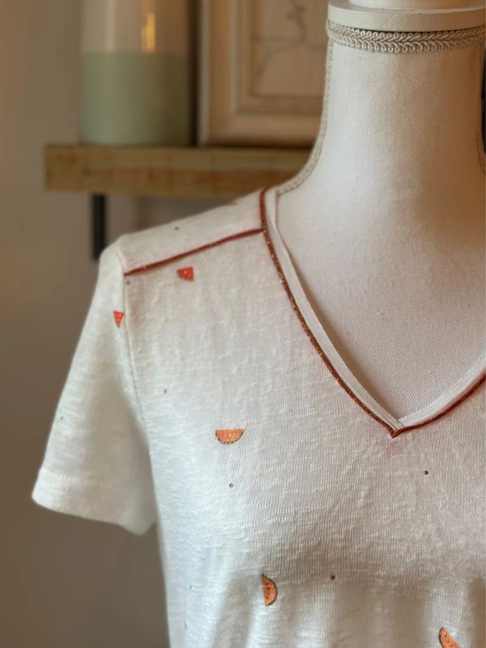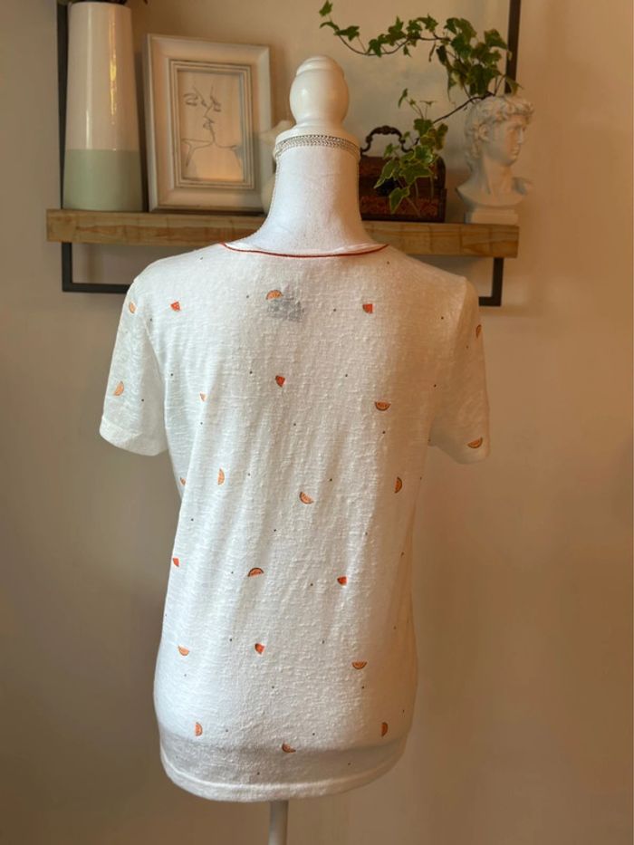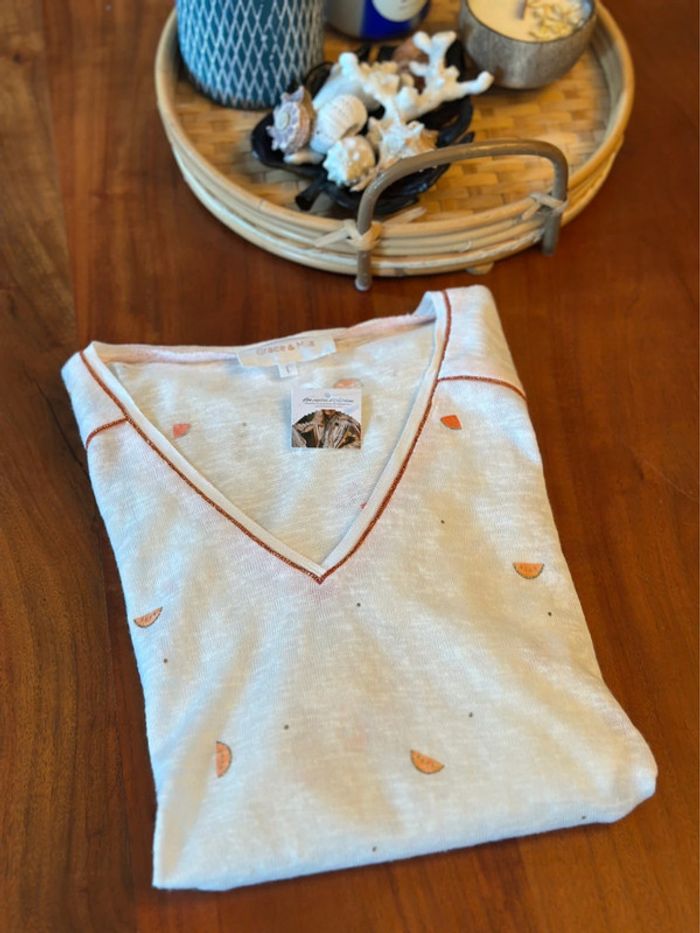 T-shirt blanc à manches courtes, en mélange coton et lin, de la marque Grace & Mila. Motifs pastèques discrets avec petits détails dorés. Col V avec surpiqûres contrastantes orange. Coupe fluide, matière légère et agréable à porter. Taille L – taille normalement. Très bon état ! ℹ️ Photo portée générée à titre illustratif, pour vous donner une idée du rendu.