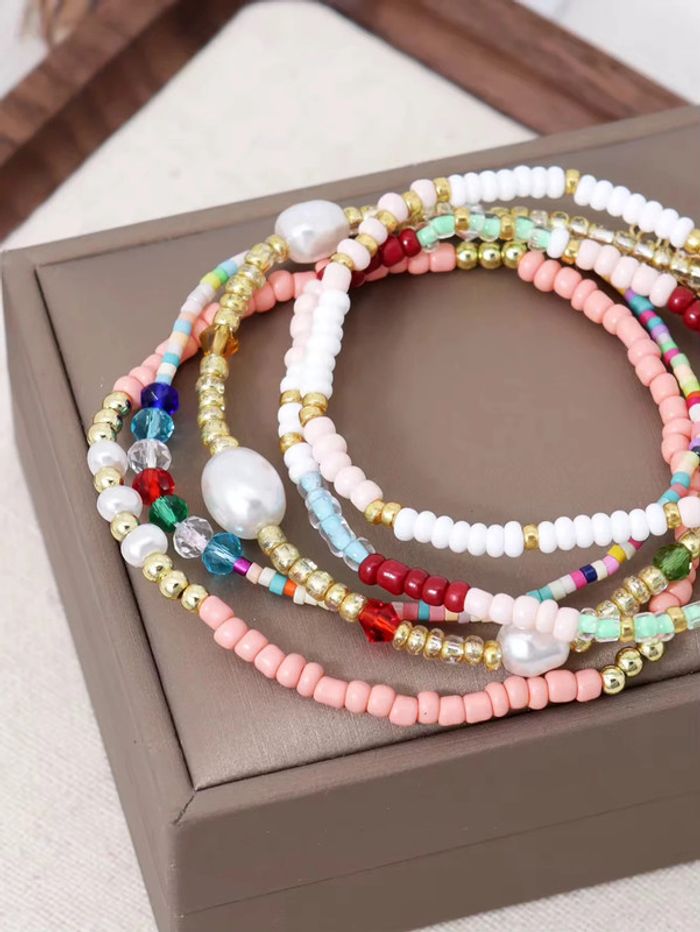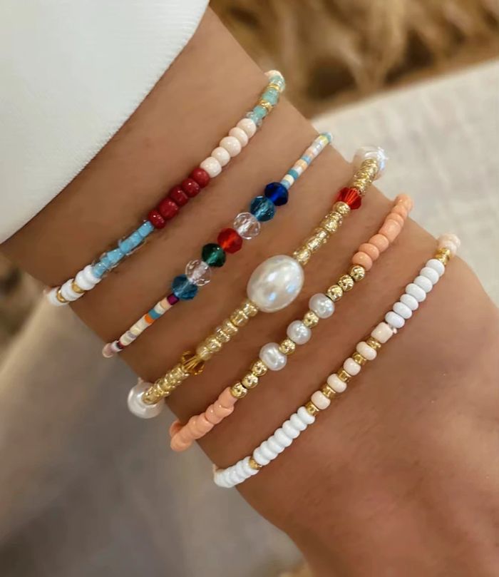 Ensemble de 6 bracelets fins et colorés, vendus uniquement en lot. Chaque bracelet est composé de perles en verre, de perles dorées inoxydables, et de véritables perles d’eau douce naturelles (non colorées). • Longueur : 5 bracelets élastiques de 17 cm + 1 bracelet ajustable (17 cm + 5 cm) • Neufs, jamais portés • Léger, confortable et agréable à porter • Parfait en accumulation ou à offrir Design bohème chic aux teintes douces et estivales.
