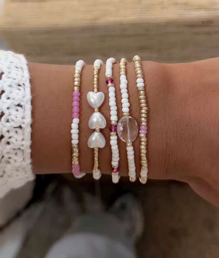 Ensemble de 5 bracelets assortis, vendus uniquement en lot. Composés de perles colorées, perles en verre et perles nacrées effet cœur, ces bracelets apportent une touche élégante et féminine à toutes vos tenues. • Longueur : 17 cm (élastiques, sans fermoir) • Matières : perles naturelles, perles en verre, perles acryliques, éléments dorés inoxydables • Neufs, jamais portés Légers, agréables à porter, et adaptés à un poignet fin ou standard grâce à leur élasticité.