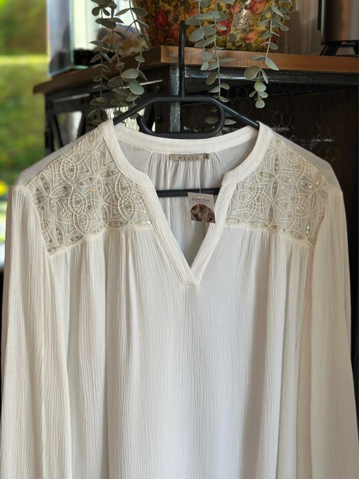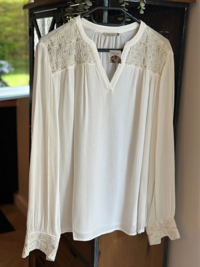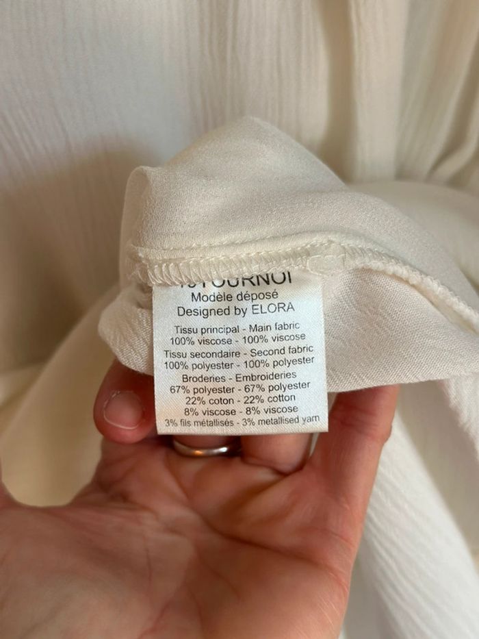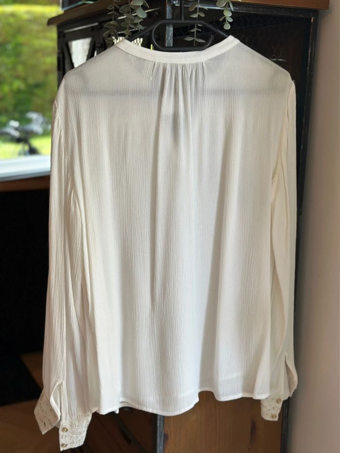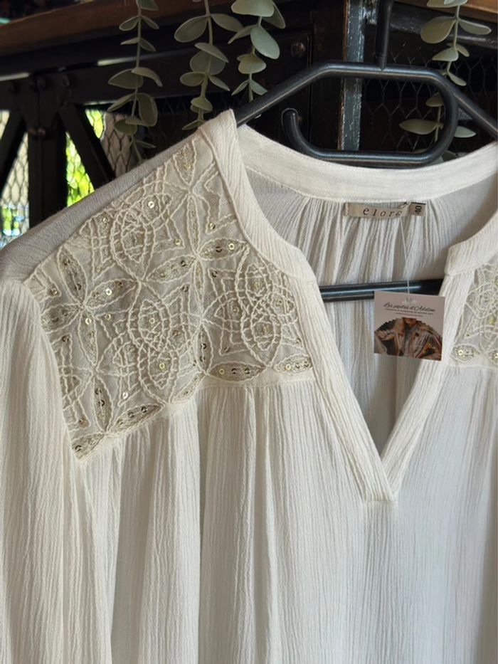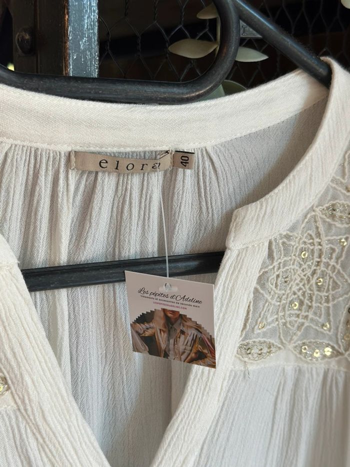 Très jolie blouse comme neuve de la marque Elora, modèle TOURNOI, taille 40. Tissu fluide et léger, agréable à porter. Détails brodés avec sequins au niveau des épaules et poignets. Encolure en V, coupe ample et féminine. • Tissu principal : 100 % viscose • Broderies : mélange de polyester, coton, viscose et fils métallisés ℹ️ Photo portée générée à titre illustratif, pour vous donner une idée du rendu.