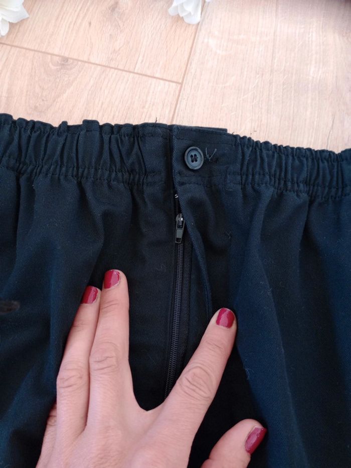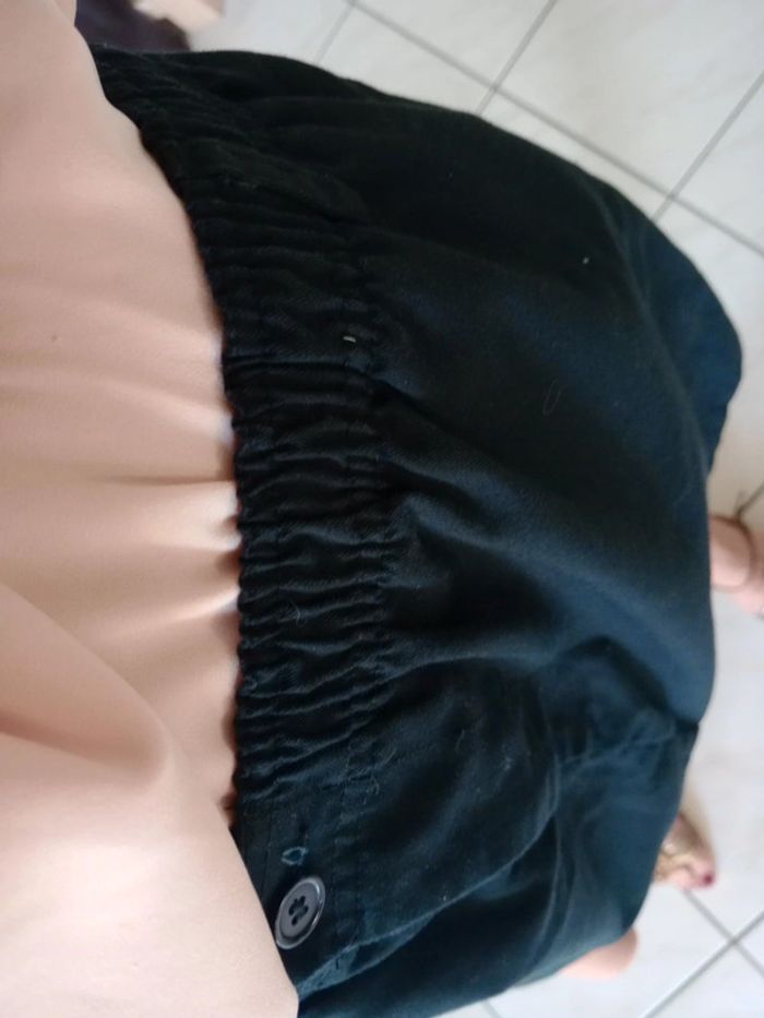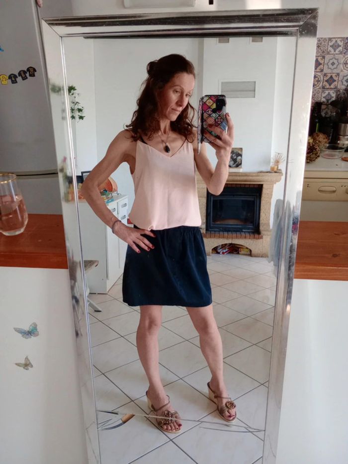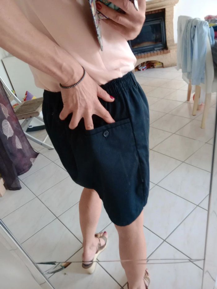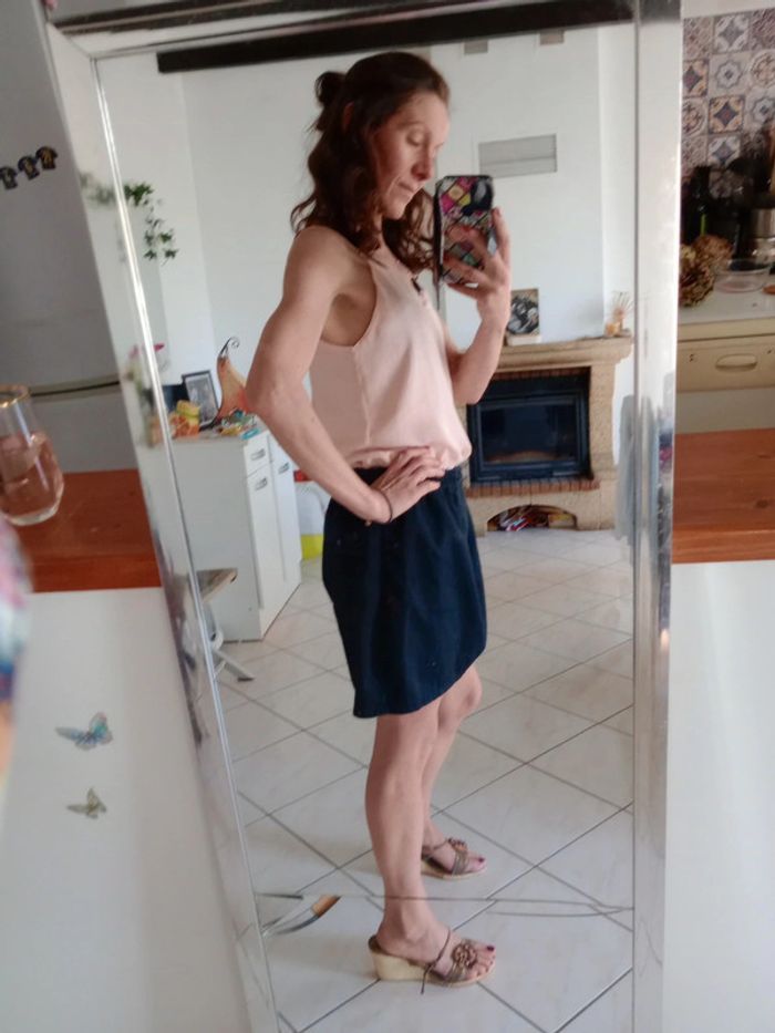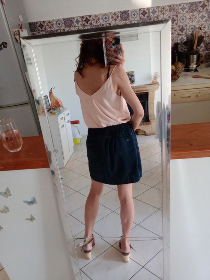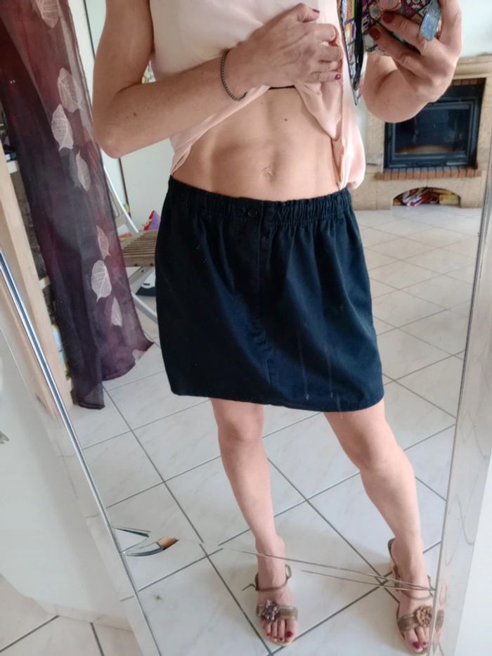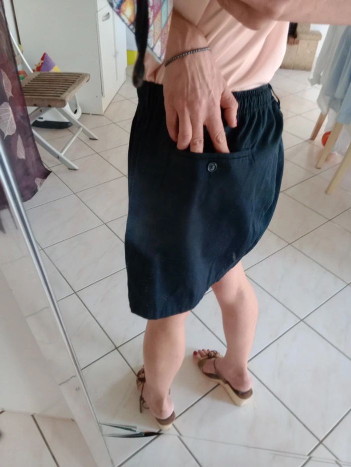 Intemporelle et indémodable Jupe avec bringuette et bouton de poche à l'arrière Indiqué taille 46 pour moi c'est plutôt une taille 42 Ceinture élastique, en étirant 50 cm autrement 38 cm Pas d'étiquette matière je pense à du coton Aspect jean #carineleray_femme_42
