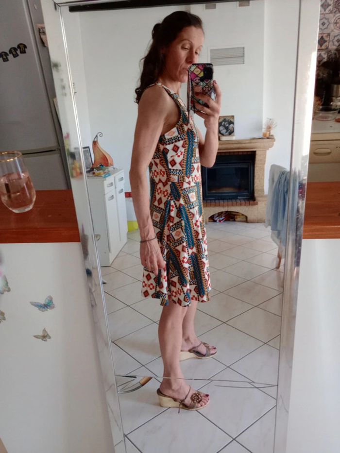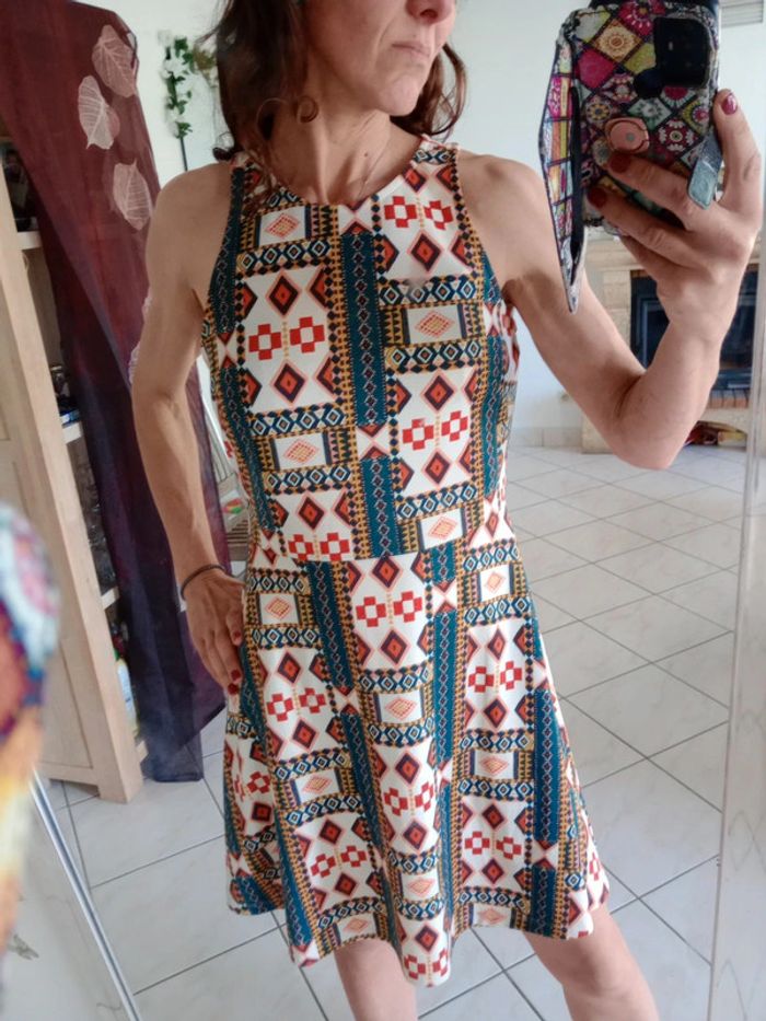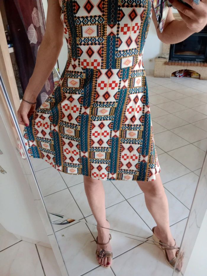 Superbe et originale😍... graphique avec ses couleurs et formes géométriques Le tissu est très agréable à porter... Contient de l'élasthanne Cintrée, cette robe est très féminine et souligne le corps parfaitement Epaule à épaule 25 cm Longueur 92 cm Aisselle à aisselle 46 cm #carineleray_femme_38