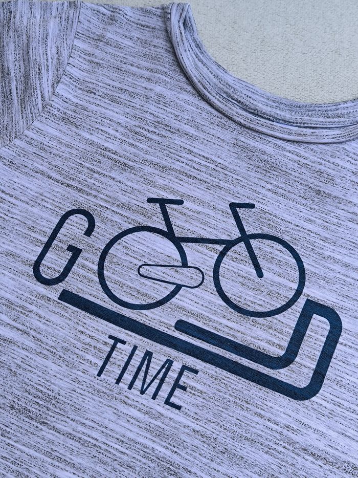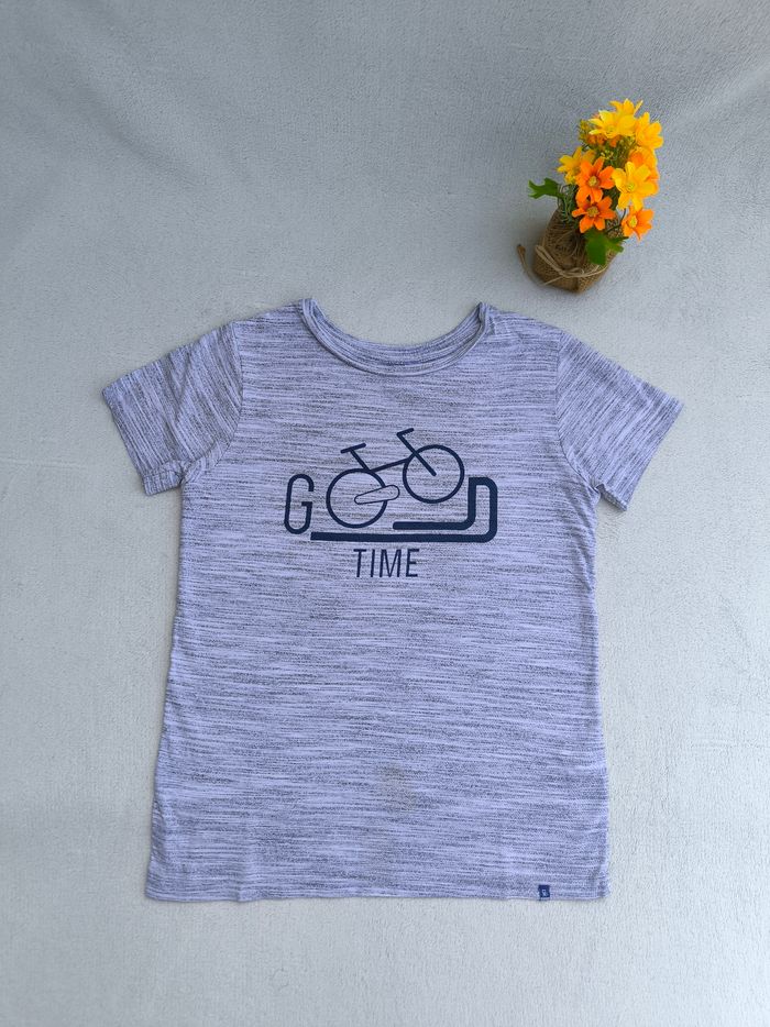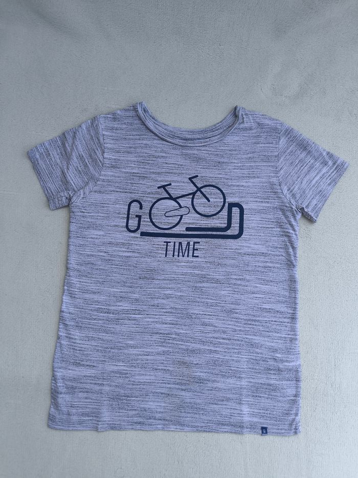 T-shirt à manches courtes Marque Okaïdi Taille 8 ans, 128 cm • Coloris gris, marine • Inscription "Good time", imprimé vélo • Coton fin • Tache sur le bas En bon état #evelyne_garcons_8ans #evelyne_garcons