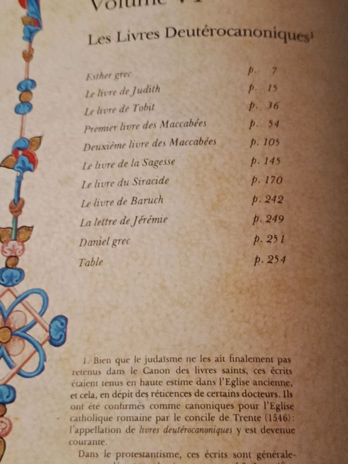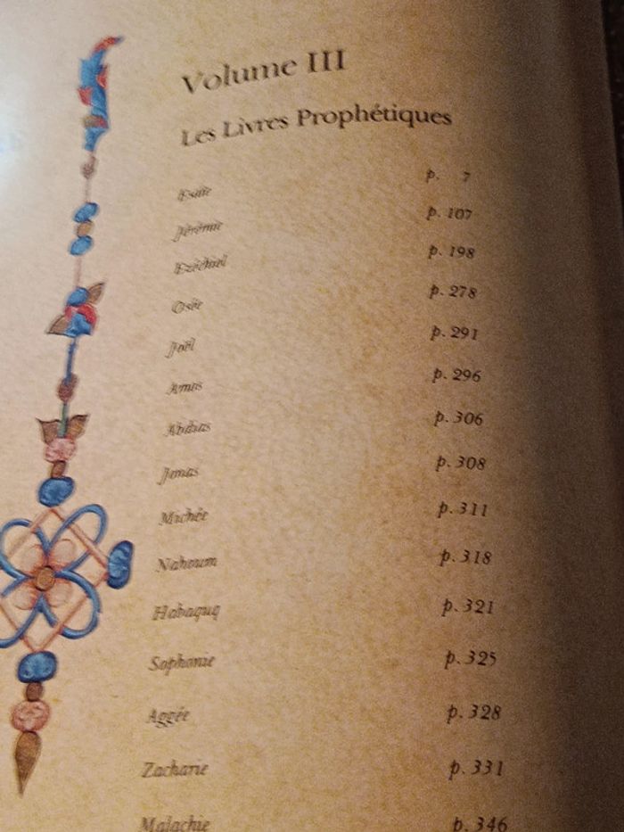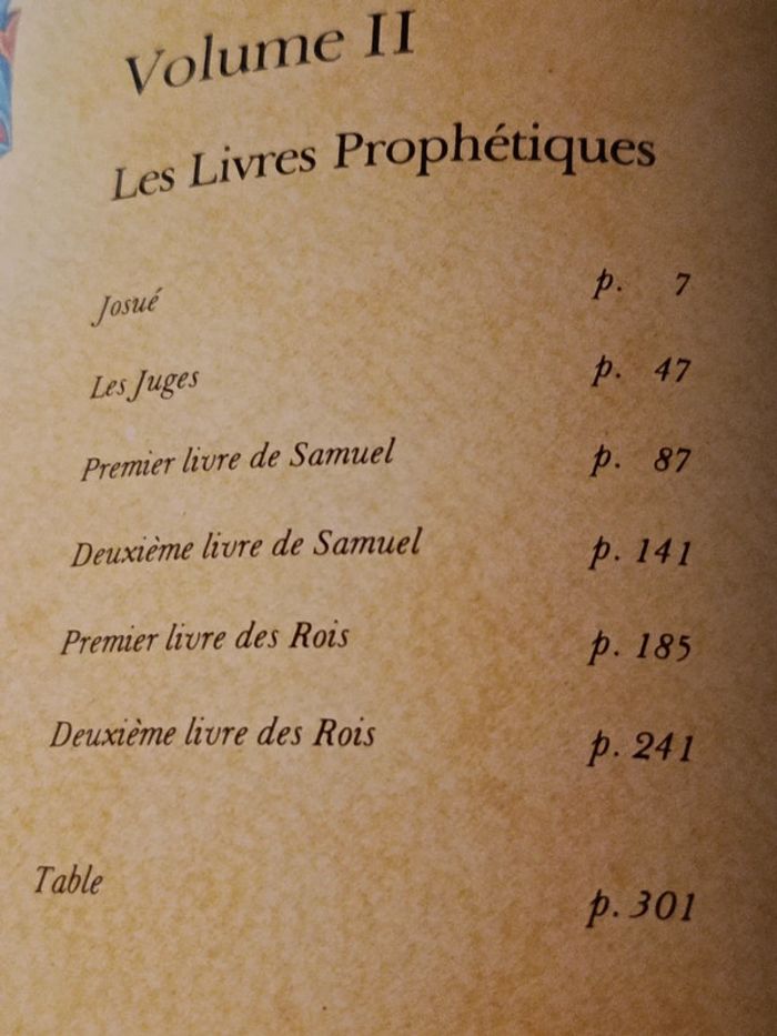 La Bible en 9 tomes Édition pour collectionneur trations sur papier glacé. Volume I : Le Pentateuque Volume II : Les prophètes premiers Volume III : Les prophètes derniers (Ésaïe, Jérémie, Ezekiel et les 12 petits prophètes) Volume IV : Psaumes, Job, Proverbes Volume V : Autres écrits (Ruth, Esdras, Néhémie, Daniel, Esther, Les Chroniques, Lamentations…) Volume VI : Livres deutdeutérocanoniques (Esther grec, Judith, Tobie, Siracide, Baruch, Maccabées 1-2, etc….) Volume VII : Évangiles & Actes Volume VIII : Épitres & Apocalypse Volume IX : Témoignage de l’art sacré