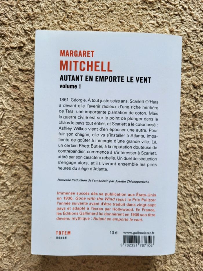 ⭐️ Nombreux livres dans mon dressing réductions sur les lots activées ✨️ 📚 Roman :Autant en emporte le vent", Volume 1 de Margaret Mitchell Édition de 2020, avec une nouvelle traduction 📖 Très bon état 📍Un incontournable pour les amoureux de grandes sagas historiques, de romance, et de littérature américaine classique 📕 Plongée au cœur de la Géorgie en 1861, à la veille de la guerre de Sécession, ce roman retrace la vie de Scarlett O’Hara, jeune femme fière et déterminée, issue d’une riche plantation du Sud. Dans ce premier volume, on découvre l’effondrement d’un monde, les illusions perdues, et la naissance d’une héroïne inoubliable, entre passions contrariées, guerre et survie.