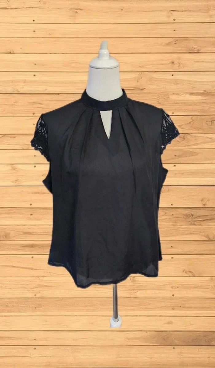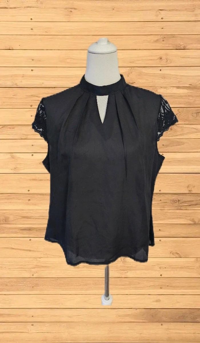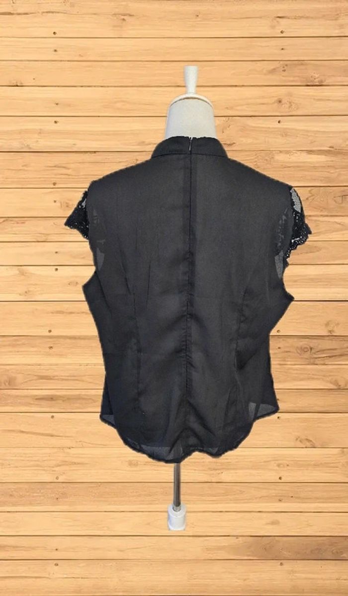 Blouse noire légèrement transparente avec manches en dentelles Sans marque Taille 3XL(52), taille petit bien faire attention aux mesures communiquées Pas d étiquette de composition Aisselles à Aisselles : 55 cm Largeur bas de blouse : 60 cm Longueur: 62 cm (07/06/2025*892)