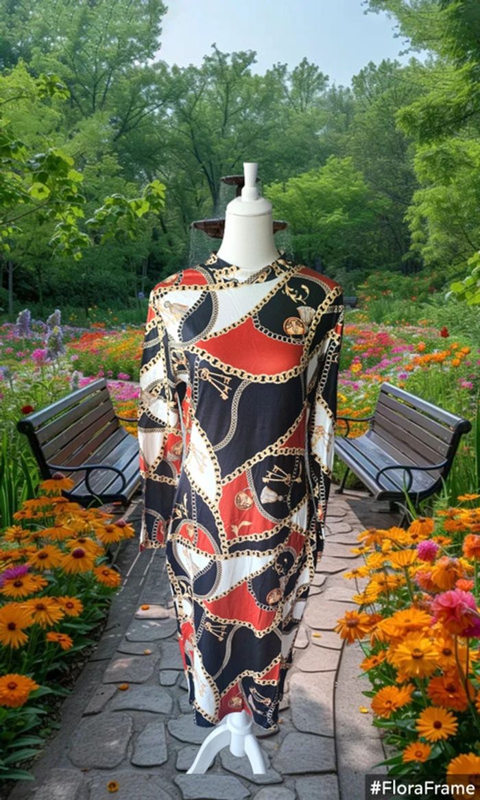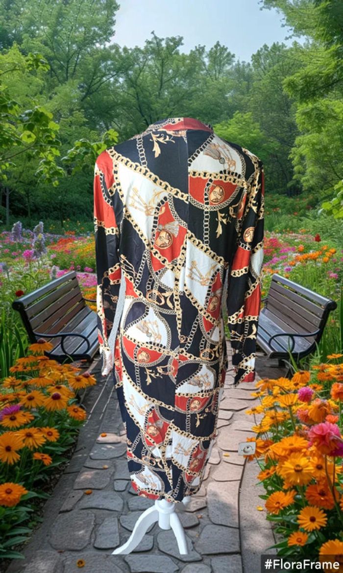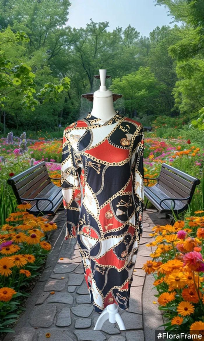 Robe longue imprimée chaines et motifs Sans marque Taille XL Tres bon état ( portee 1 fois) 95% polyester/ 5% elastane Aisselles à Aisselles : 50 cm Epaules à epaules : 44 cm Hanches: 45 cm Longueur : 110 cm (30/05/2025*816)