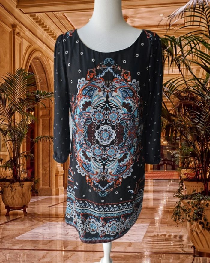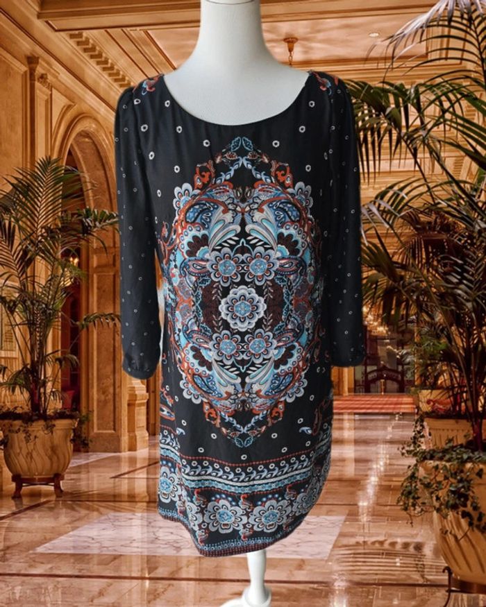 Robe satinée a motifs De marque promod Taille 40 Tres bon état Étiquette de composition coupée Aisselles à Aisselles : 45 cm Hanches: 46 cm Longueur: 92 cm Fermeture éclair sur le côté (29/05/2025*802)