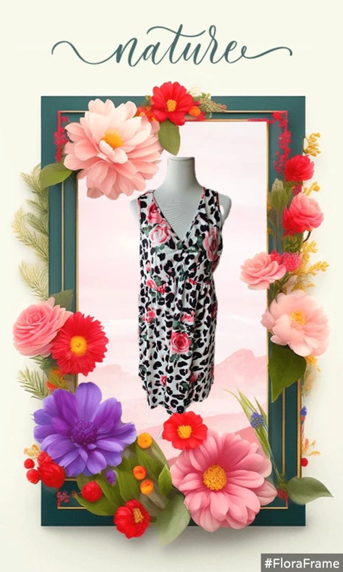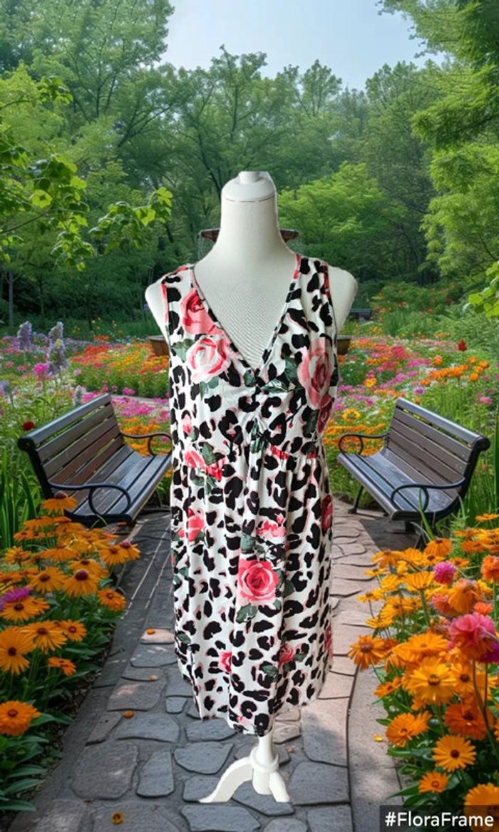 Robe imprimée léopard fleurie Sans marque Taille 1 XL ( 48) Tres bon état ( portée une fois) 95% polyester/ 5% elastane Aisselles à Aisselles : 52 cm Hanches: 62 cm Longueur: 95 cm (27/05/2025*766)
