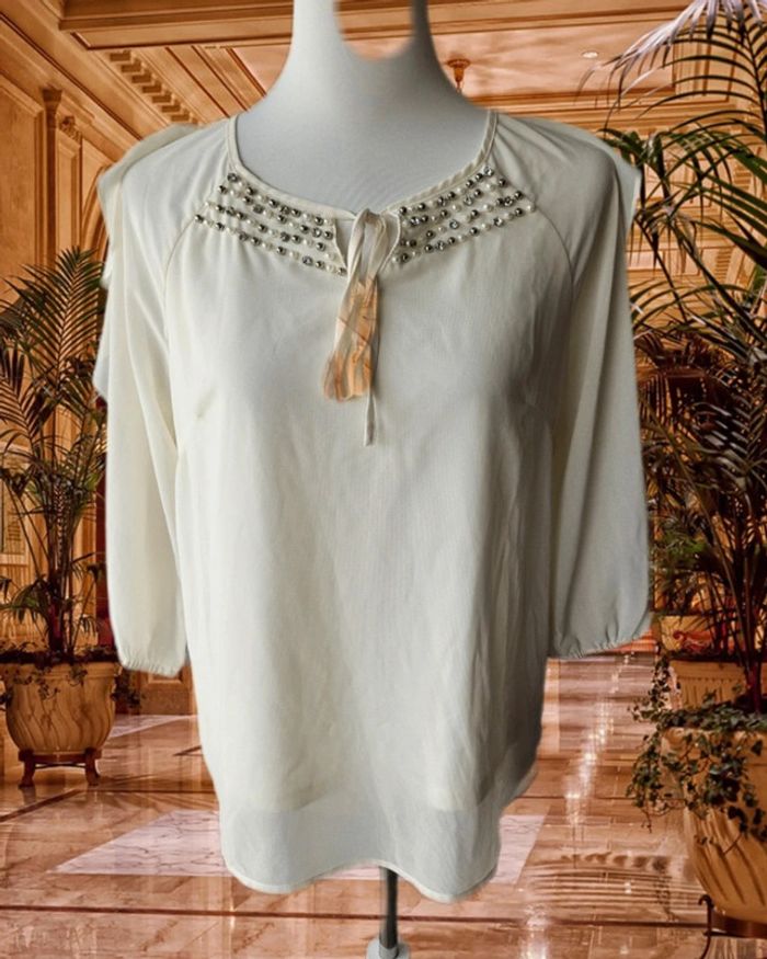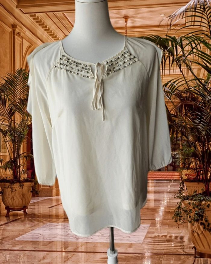 Blouse crème avec perles au col et son flot, Tusalandri, taille 2 (40/42) - photo numéro 1