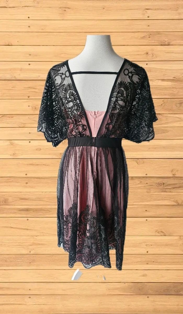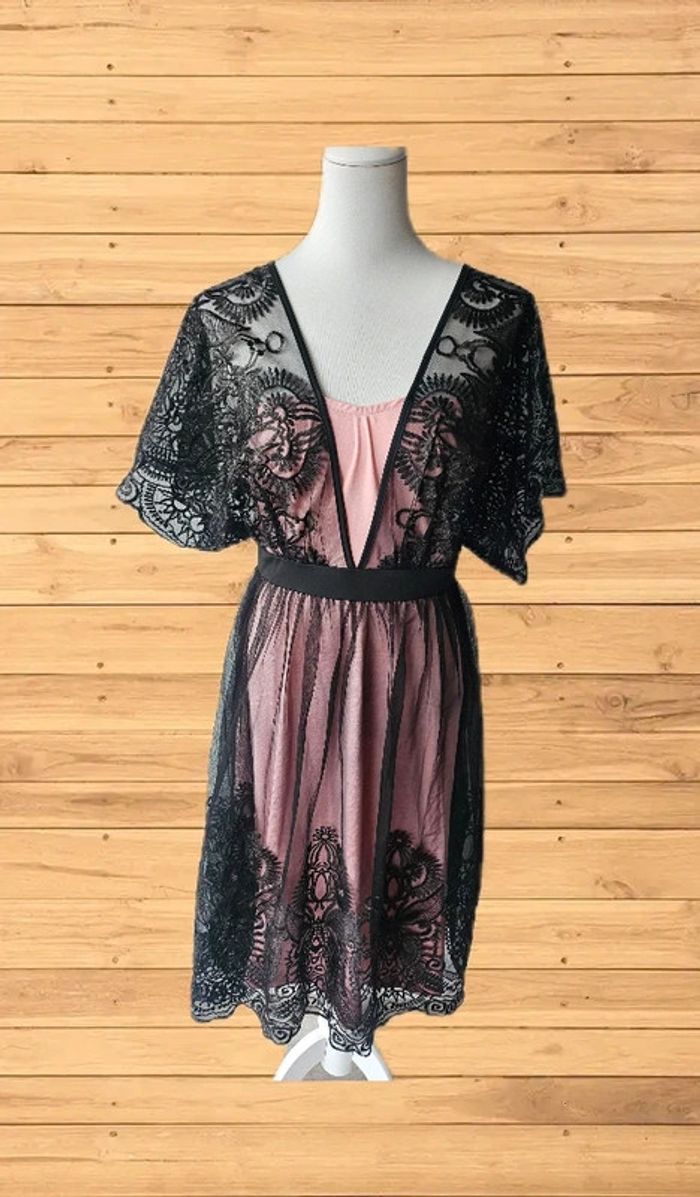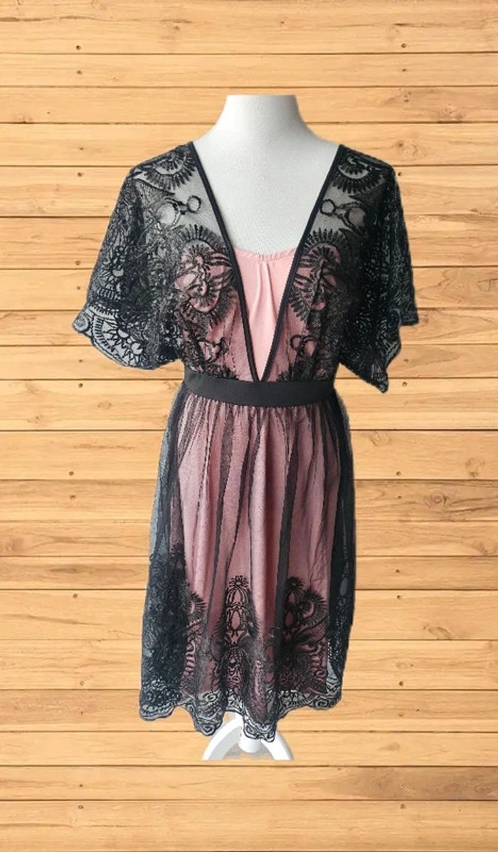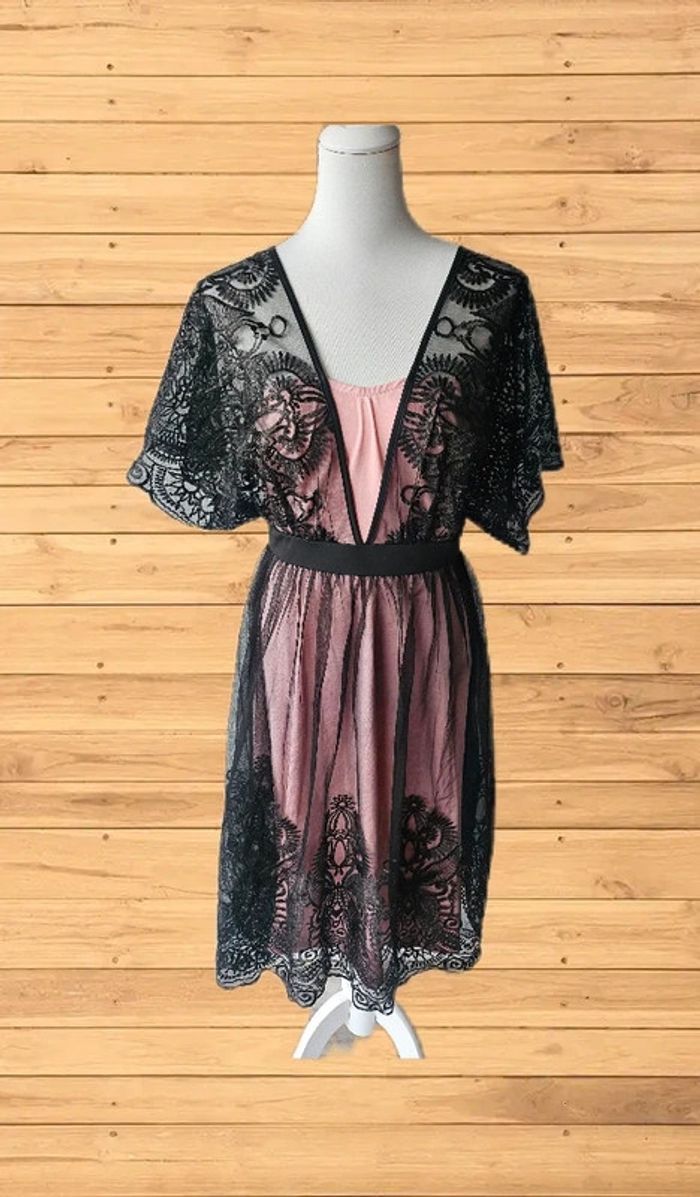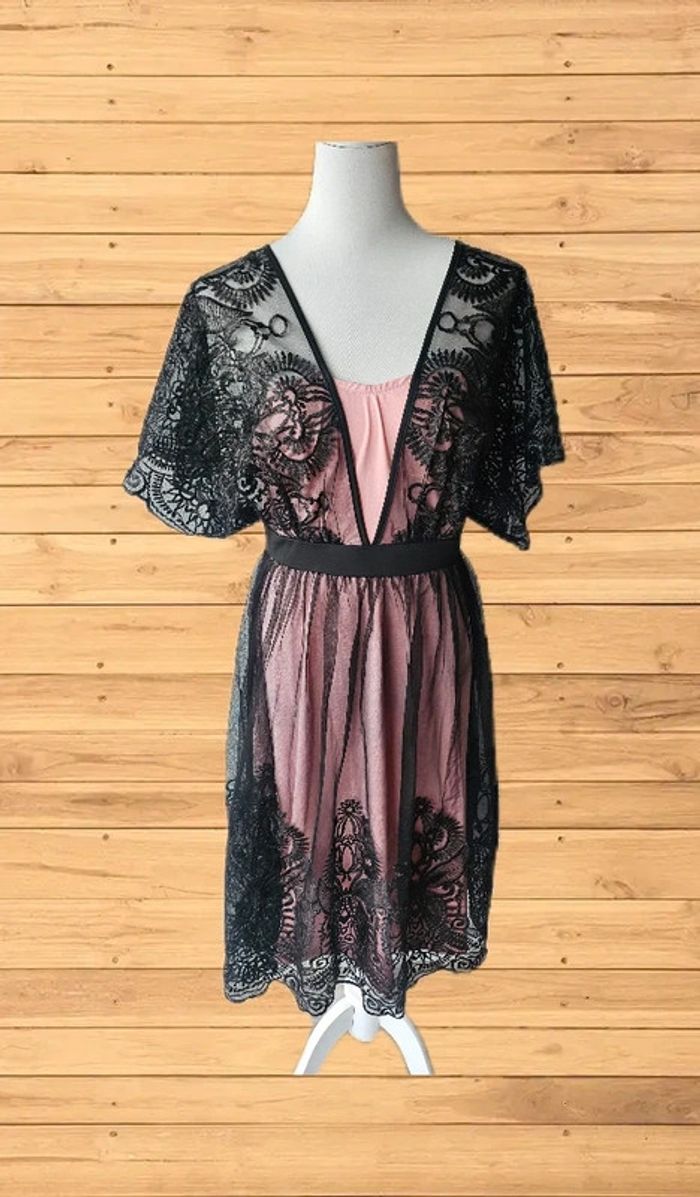 Robe en dentelle noire/rose, sans marque, taille M - photo numéro 1
