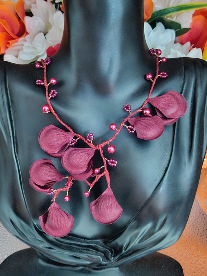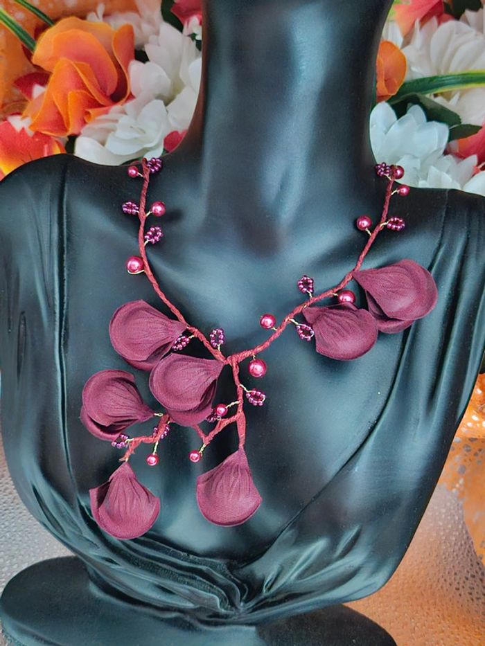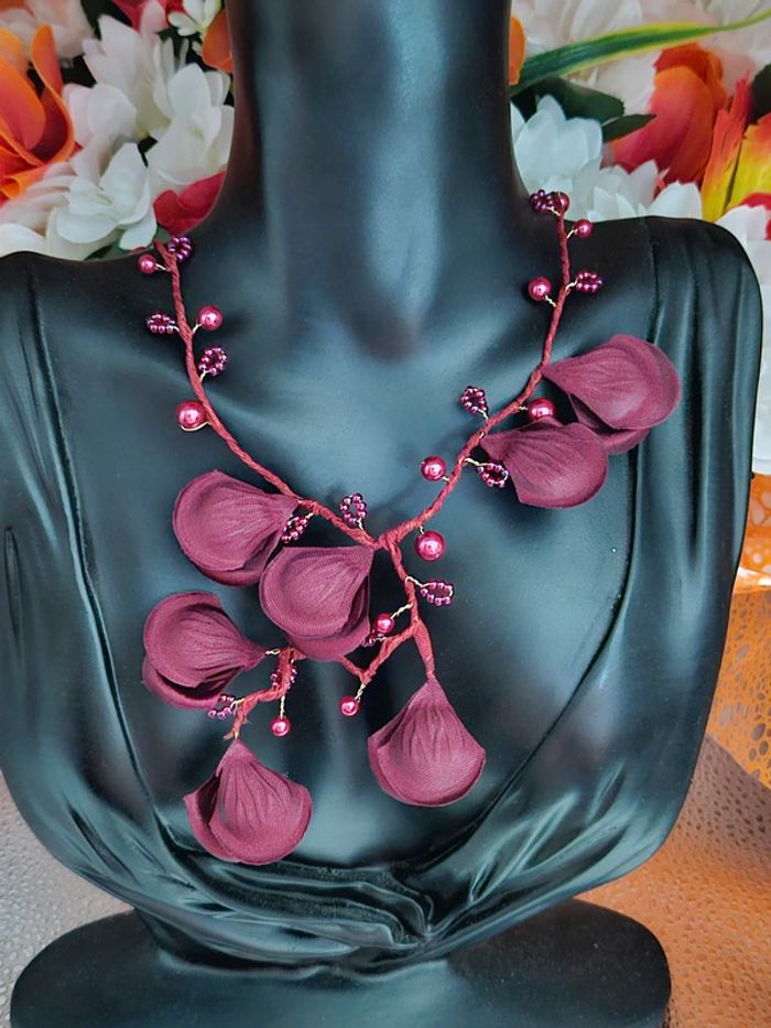 Collier avec ses fleurs et perles bordeau Neuf sans étiquette, jamais porté Sans marque Monture en acier inoxydable hypoallergenique haute qualité Ne noircit pas au fil du temps Ne rouille pas Collier réglable (20/05/2025*717)