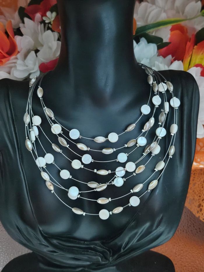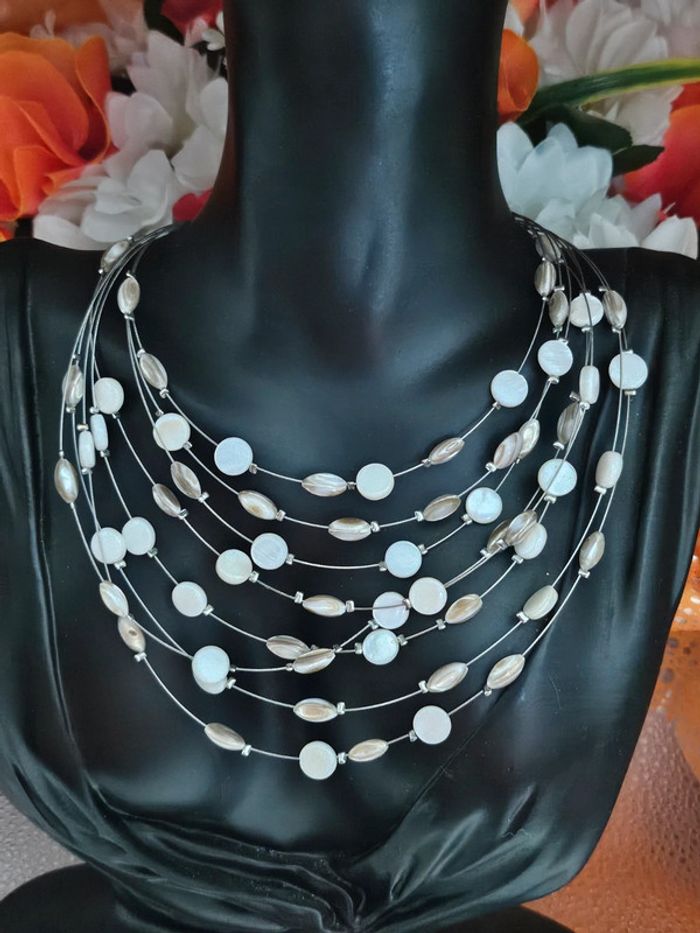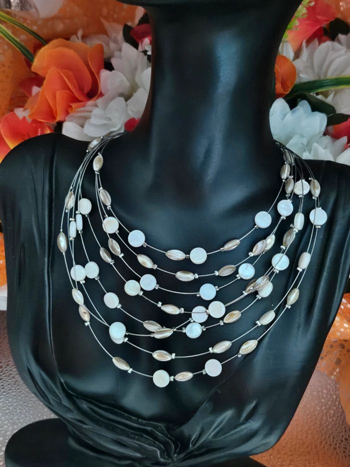 Collier avec ses rangs de perles Neuf sans étiquette, jamais porté De marque Ikita En acier inoxydable hypoallergenique haute qualité Ne noircit pas au fil du temps Ne rouille pas Bonne résistance au passage sous l eau Collier réglable (20/05/2025*716)