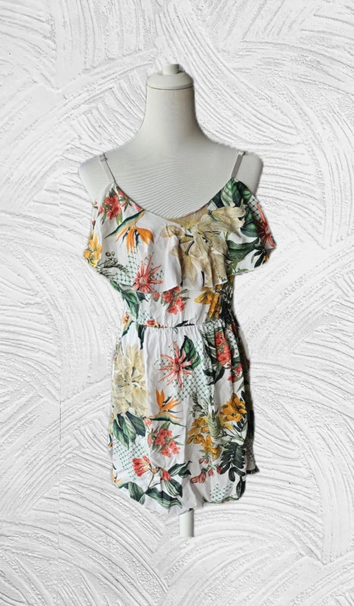 Robe avec ses fleurs multicolore De marque New collection Taille 38 Tres bon état 95% coton 5% elastane Aisselles à Aisselles : 37 cm Hanches: 35 cm Longueur: 84 cm Élastique à la taille Bretelles réglables (21/05/2025*724)