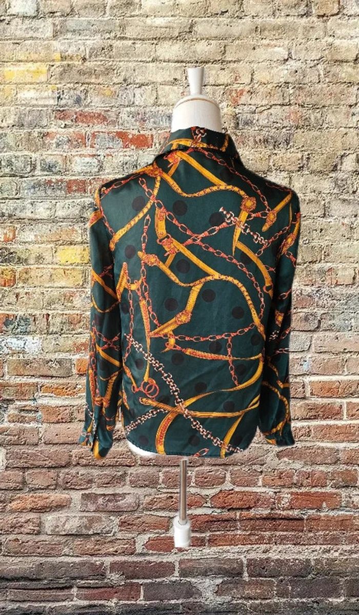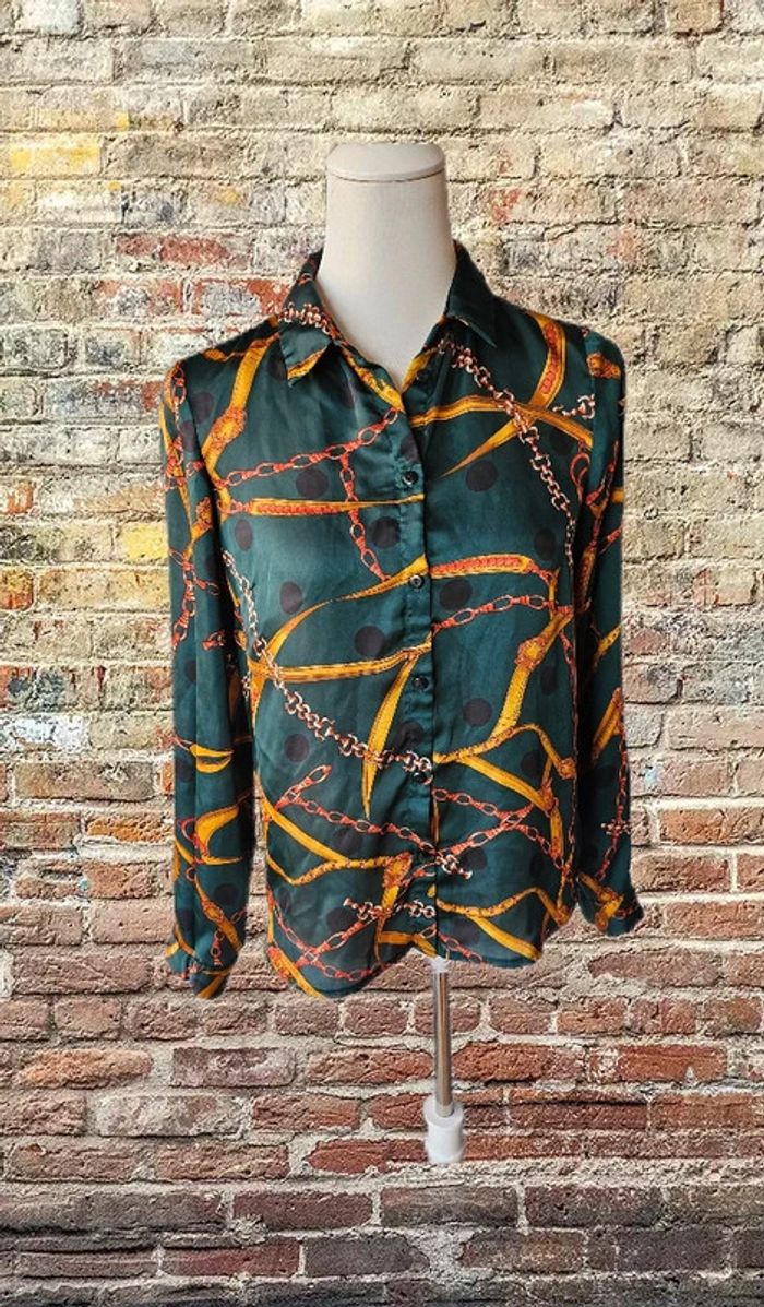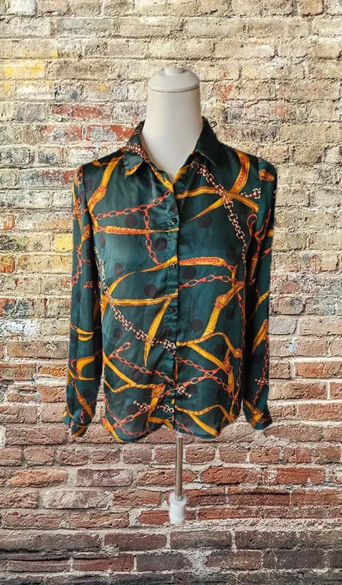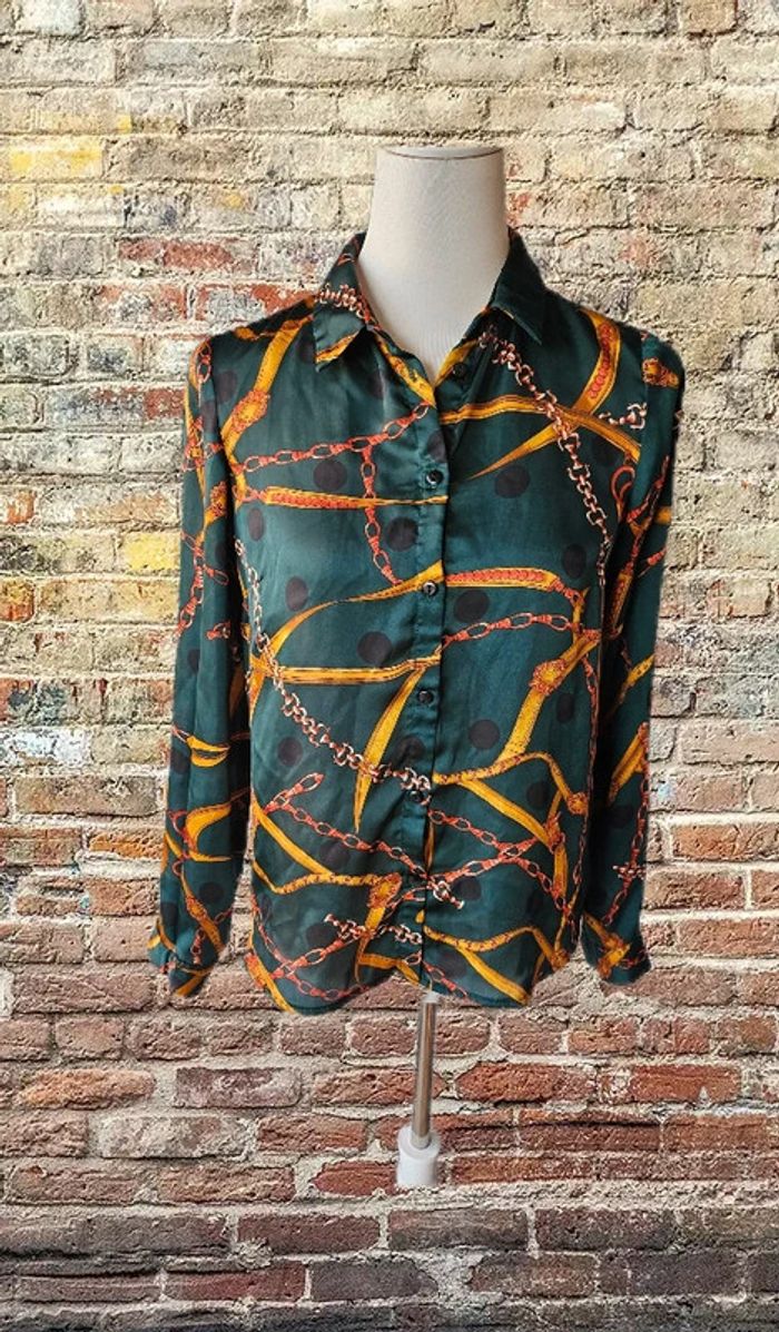 Chemise satinee avec ses chaines imprimée De marque Camaïeu Taille 40 Tres bon état Étiquette de composition coupée Aisselles à Aisselles " 45 cm Largeur bas de chemise: 48 cm Longueur: 56 cm (19/05/2025*698)