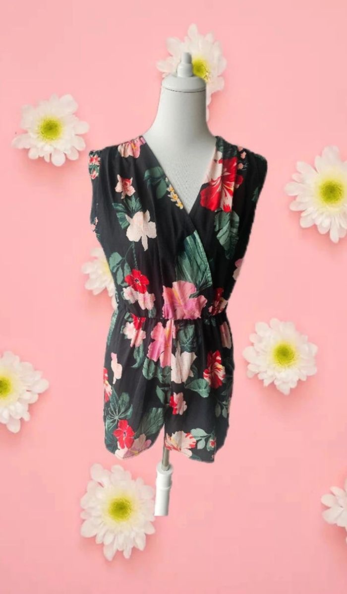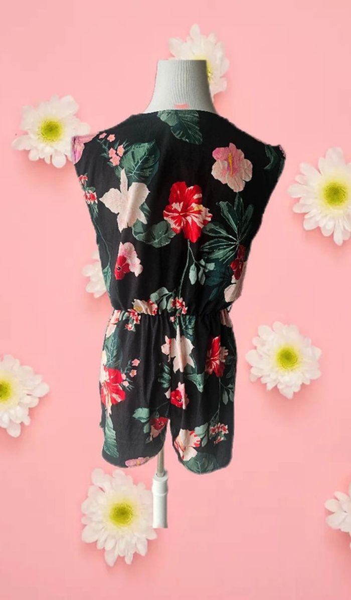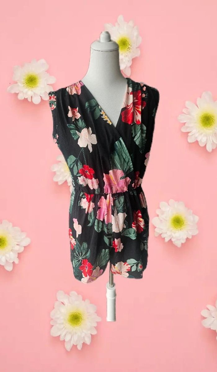 Combishort fleurie noire/multicolore De marque Terranova Taille S Tres bon état 100% polyester Aisselles à Aisselles: 42 cm Hanches: 35 cm Largeur bas de cuisse : 34 cm Longueur: 80 cm Élastique à la taille (17/05/2025*683)