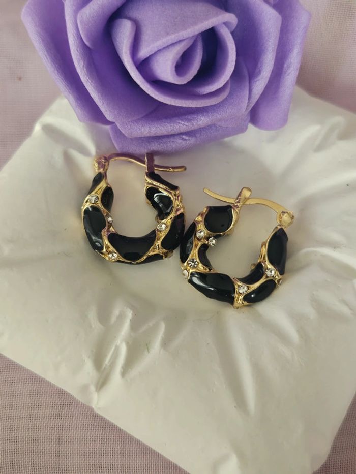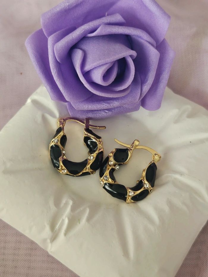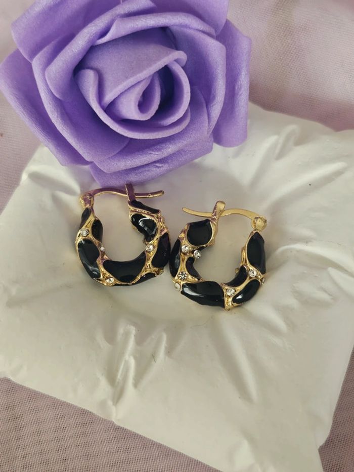 Minis créoles noires/dorees avec zirconium, acier inoxydable hypoallergenique - photo numéro 3