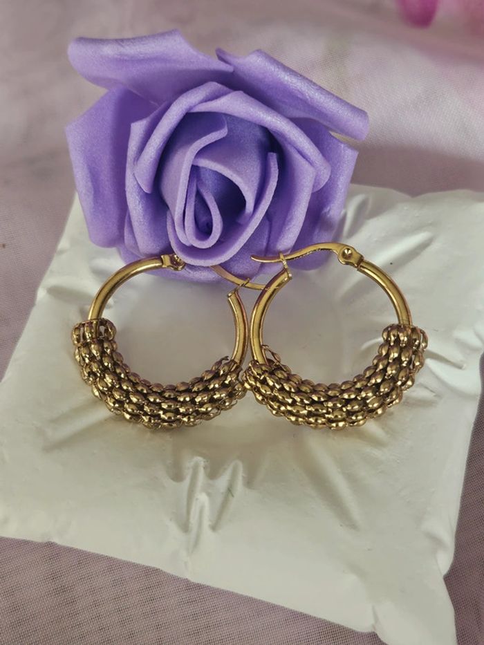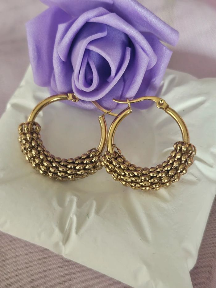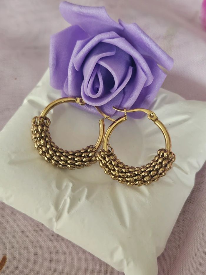 Créoles semi texturees dorées Neuves sans étiquette, jamais portées De marque Aihhq En acier inoxydable hypoallergenique haute qualité Ne noircit pas au fil du temps Ne rouille pas Bonne résistance au passage sous l eau Pour oreilles percées Diamètre 2.5 cm (17/05/2025*675)