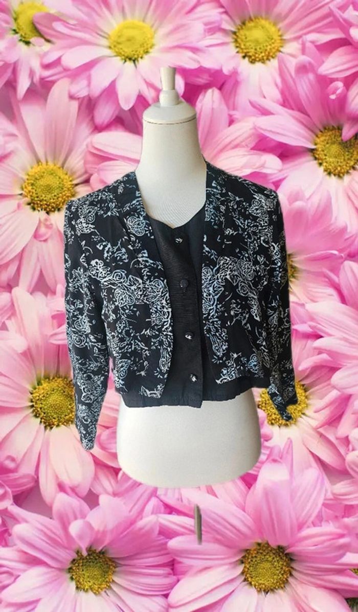 Blouse courte avec boléro a motifs intégré Sans marque Taille 38 Tres bon état Étiquette de composition effacée Aisselles à Aisselles : 43.5 cm Largeur bas de blouse: 48 cm Longueur: 42.5 cm (16/05/2025*668)