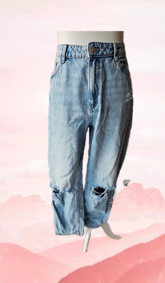 Jean bleu clair troué De marque denim pimkie Taillz 42 Tres bon état 100% coton Largeur taille: 42 cm Hanches: 50 cm Largeur bas de jambes : 15 cm Longueur: 95 cm (13/05/2025*646)