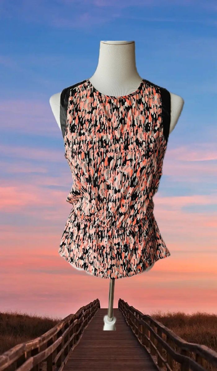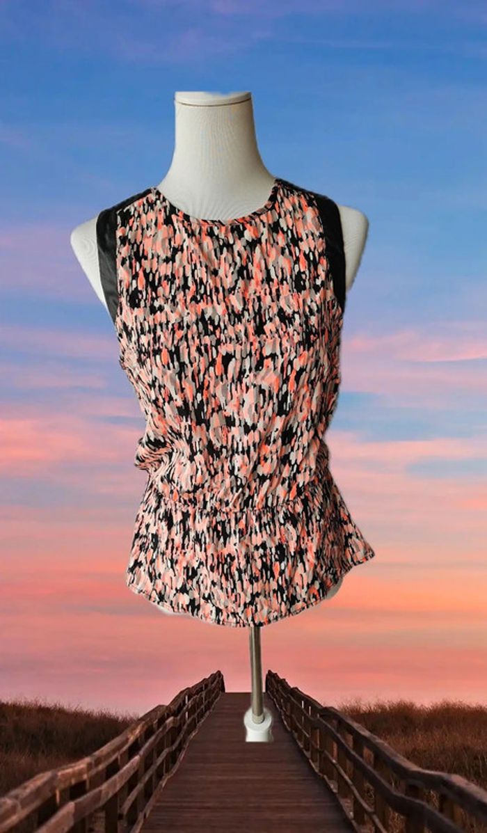 Blouse sans manches dégradée de couleurs et finition en simili cuir De marque Arkitect Taille 38 Tres bon état 100% polyester Aisselles à Aisselles: 40 cm Largeur bas de blouse: 42 cm Longueur: 60 cm Élastique à la taille (15/05/2025*661)