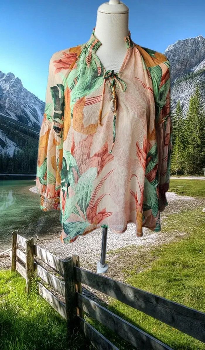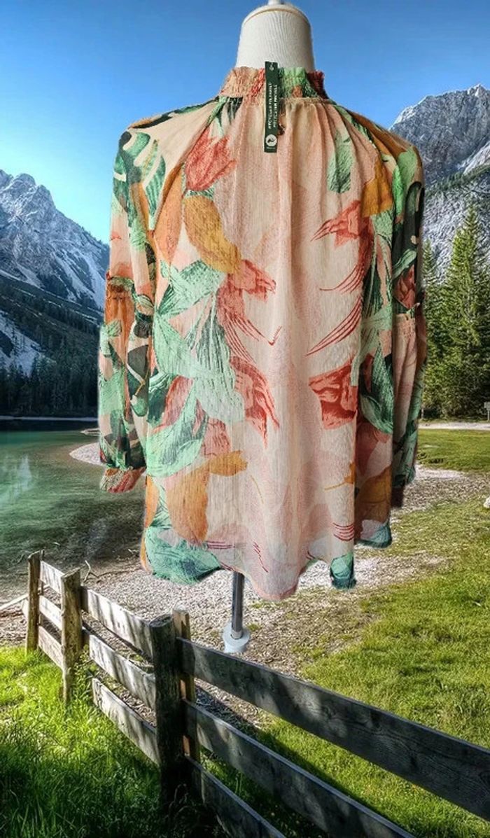 Blouse fleurie avec cordage De marque Kaporal Taille S Neuve avec étiquette 100% polyester recyclé ♻️ Aisselles à Aisselles: 51 cm Largeur bas de blouse: 54 cm Longueur: 67 cm Élastique aux poignets et au col (10/05/2025*607)