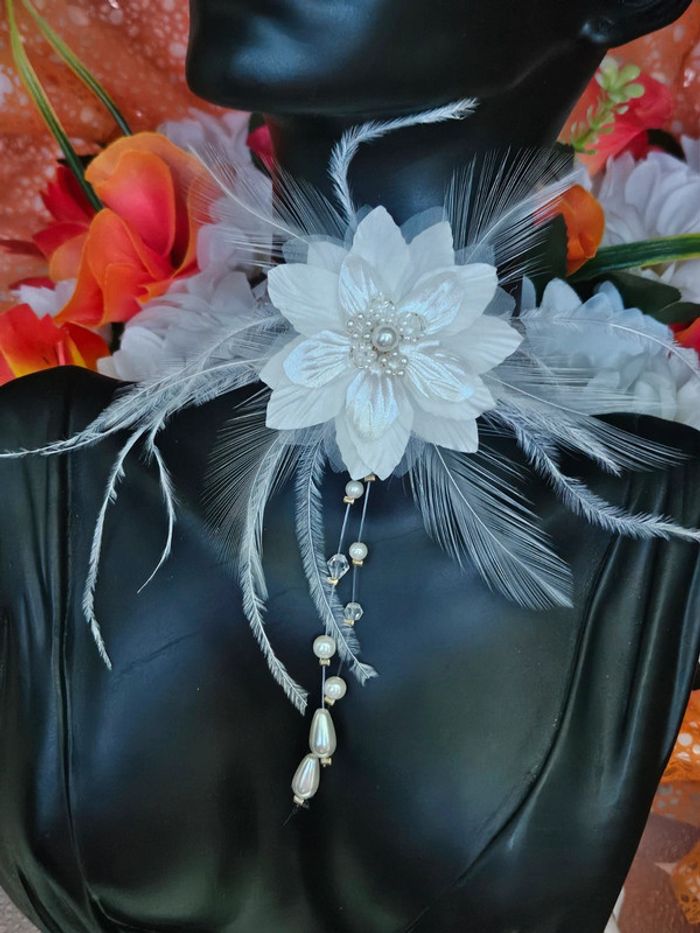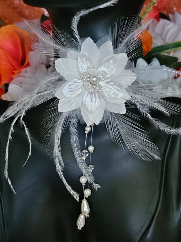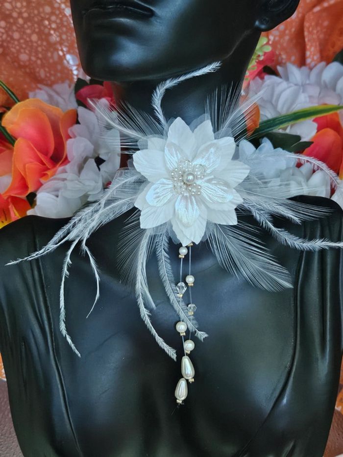 Ras de cou avec sa grosse fleur, perles d eau douce et ses plumes