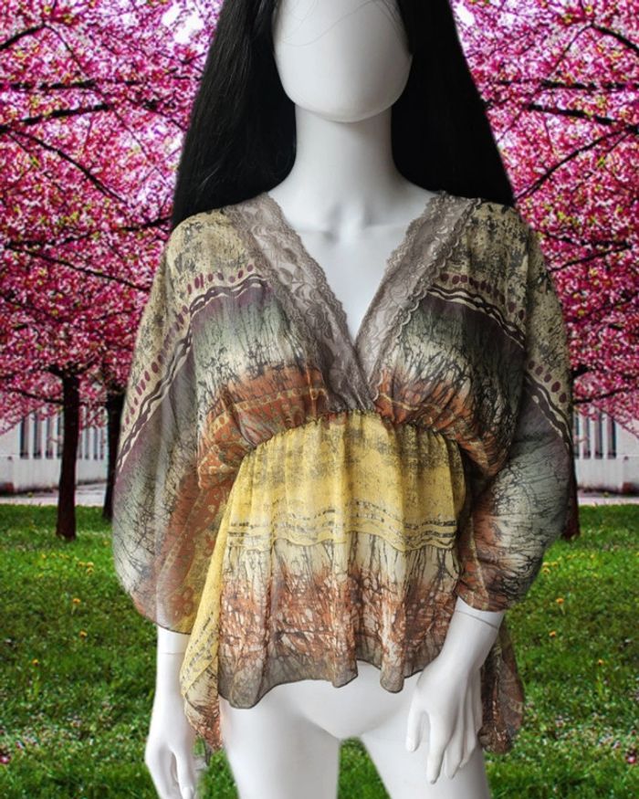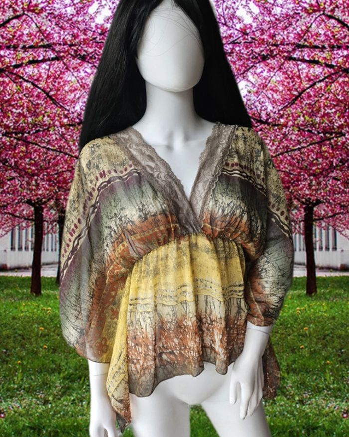 Blouse fluide avec manches papillons et col en dentelle De marque Anyplace Taille S Très bon état 100% polyester Pas de mesures sur cet article (07/05/2025*582)