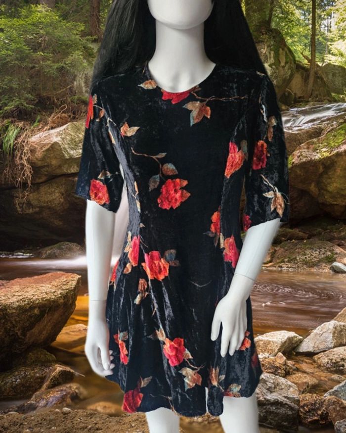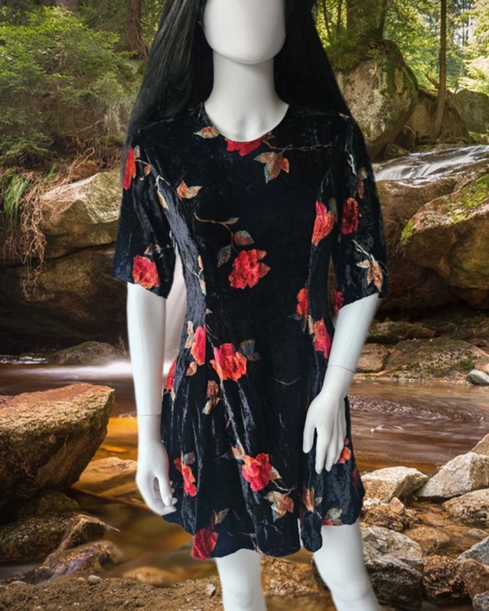Robe en velours avec ses fleurs Sans marque Taille 40 Tres bon état Pas d étiquette de composition Aisselles à Aisselles: 46 cm Hanches: 40 cm Longueur: 86 cm (08/05/2025*570)