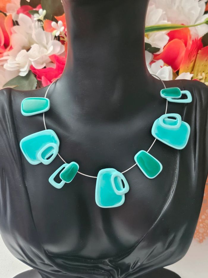 Collier avec ses formes bleues/vertes Neuf sans étiquette, jamais porté De marque Ikita En acier inoxydable hypoallergenique haute qualité Ne noircit pas au fil du temps Ne rouille pas Bonne résistance au passage sous l eau Collier réglable (30/04/2025*472)
