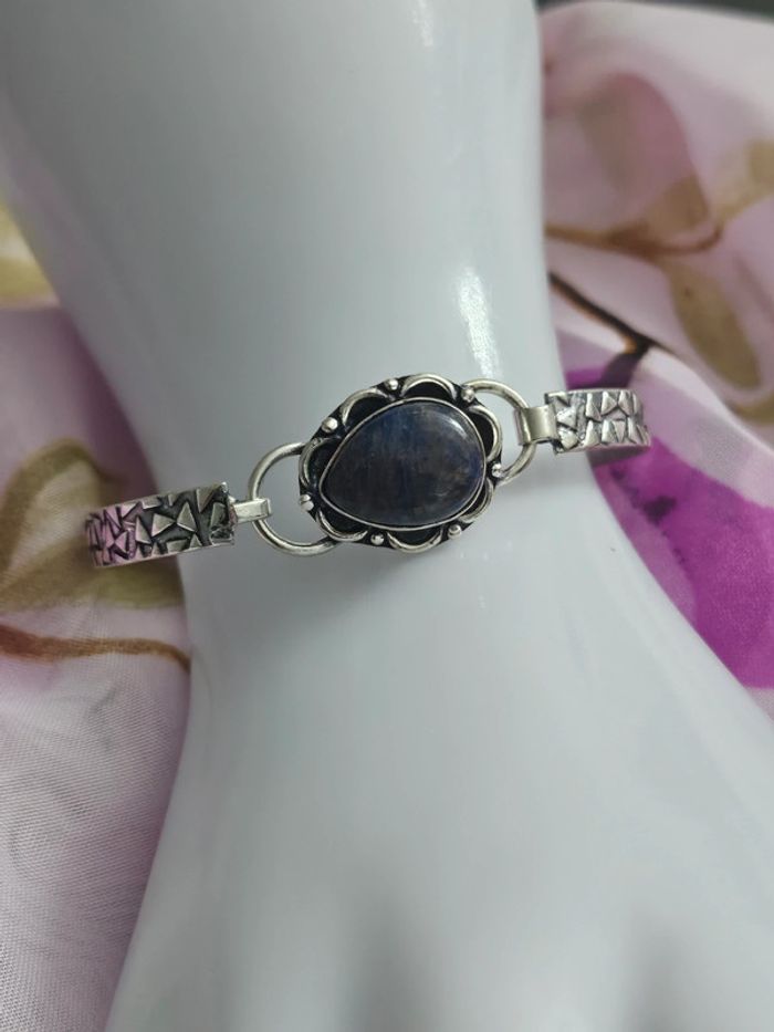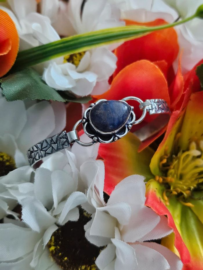 Bracelet texturé en argent sterling 925 avec pierre sodalite Neuf sans étiquette, jamais porté Piece unique en pierre naturelle SERTIE Estampillé 925 Taille ajustable Poids du bracelet: 11 grammes (25/04/2025*397)