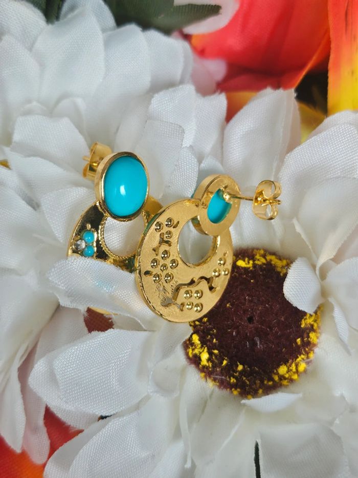 Je vous propose cette paire de boucles d'oreilles avec ses pierres turquoise synthetisees. Neuves sans étiquette, non utilisées. En acier inoxydable hypoallergenique ( garantie contre les allergies). Résistantes a l eau. Pour les oreilles percées. (13/04/2025*112)